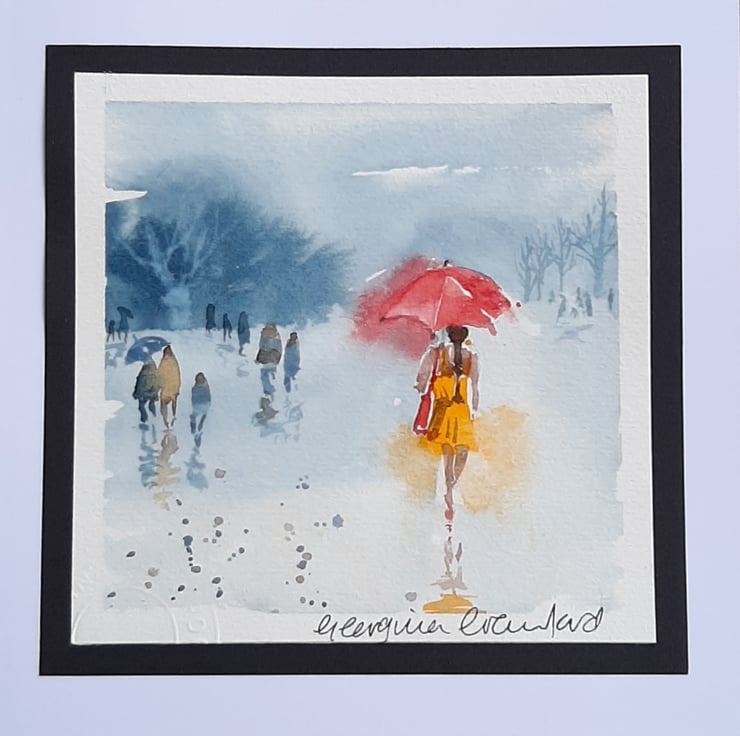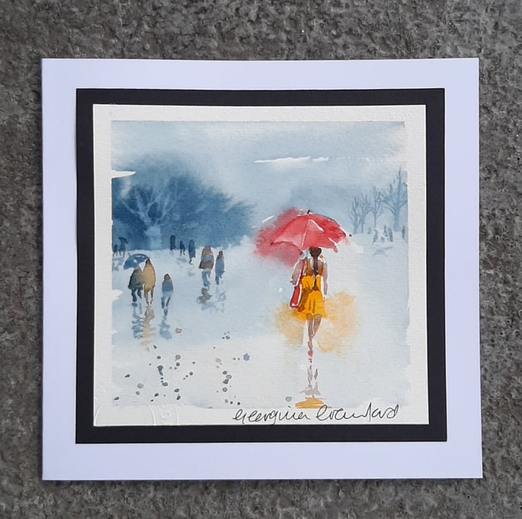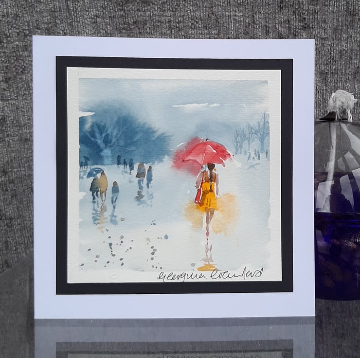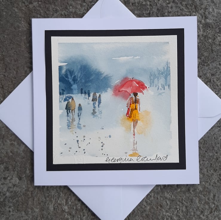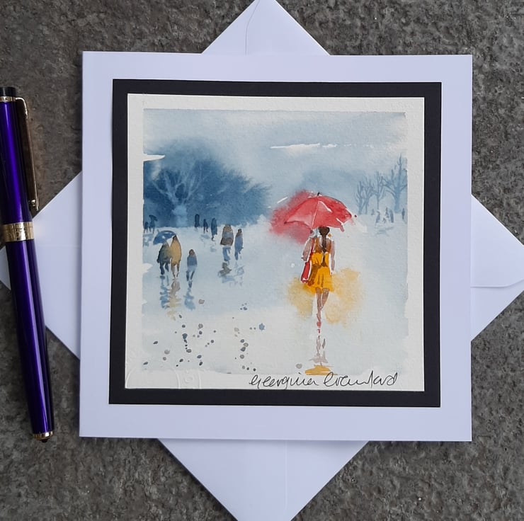 Beautiful handpainted watercolour card of a rainy day and a woman in a yellow dress.