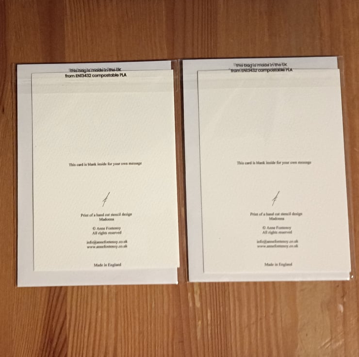 The Madonna image is one of my designs I made hand cut stencils for from one of my pencil drawings I made from imagination. I then airbrushed the design onto card. I have scanned an original card and I print the cards myself using archival inks and an A4 desktop inkjet printer onto an English 190 gsm fine art paper with the surface prepared for digital print.
