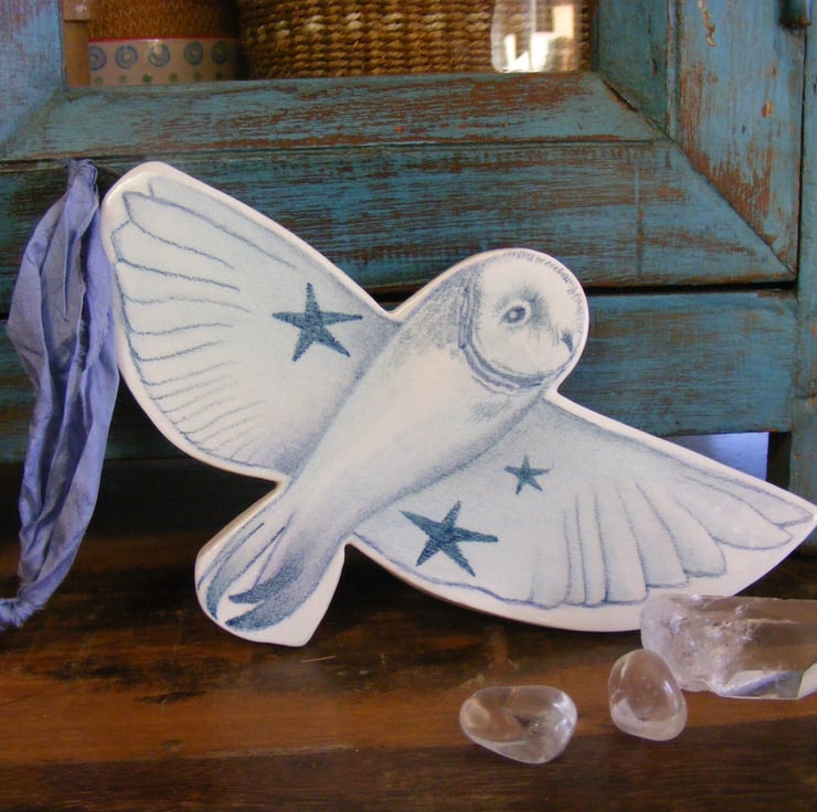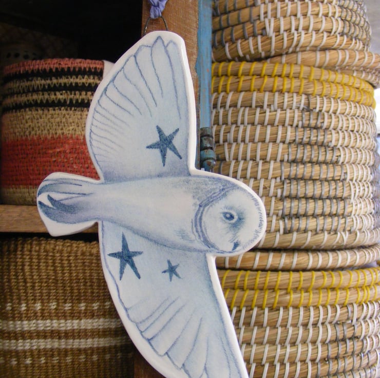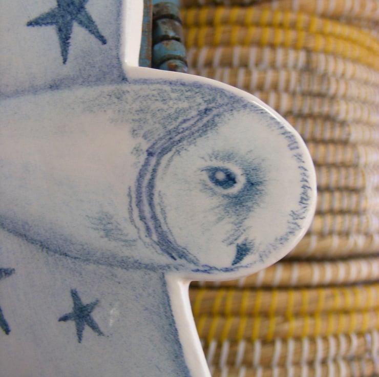 Cut from Earthenware clay, fired and hand painted with underglaze and a transparent glaze on top for durability. This is not frost proof please do not put it outside. The owl measures approx 7.5 L" x 4.5" W x 1/4" D and has a ceramic metal hook fired into the top wing, with a blue sari ribbon attached. This is hand painted and not a ceramic transfer.