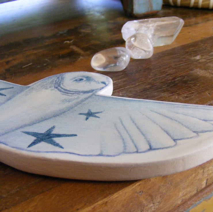 A Barn Owl ceramic that is flat and can hang either on the wall or a cabinet, the choice is yours!