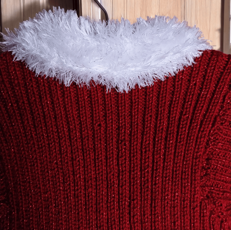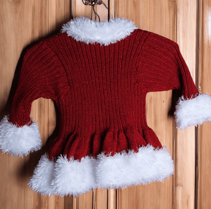 Make every occasion magical with this hand-knitted girls' sparkly red cardigan, adorned with soft, fluffy white trim. Perfect for Christmas, family photos, or festive parties, this cardigan features a charming peplum hem and glittery red buttons for added glamour.