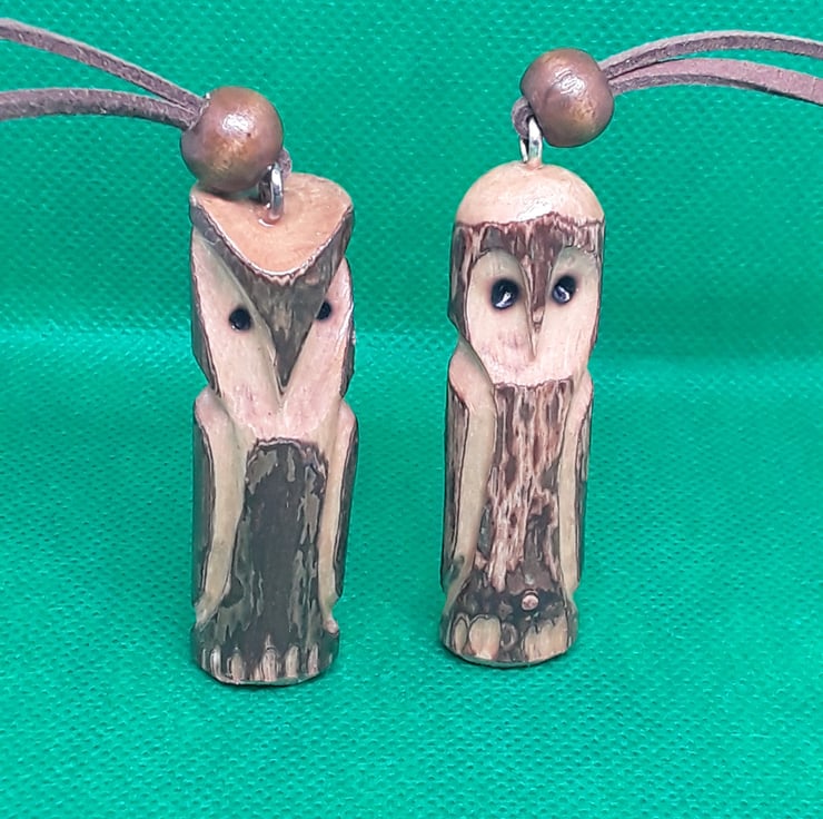 Two owl necklaces hand carved from Hazel twigs, charming and very rustic, you could give one to a friend or family member. Size is approximately 5.5cmx1.5cm. I provide enough cord to tie to the length you require.