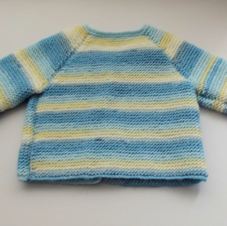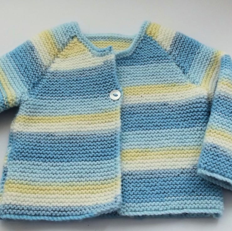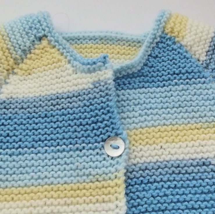 Hand knitted by me. Blue, Lemon and White Cardigan Jacket. Round neck with 1 shell button closure. Knitted in fine weight acrylic blend yarn. hm72