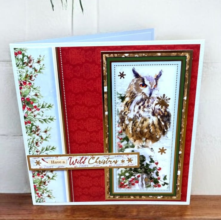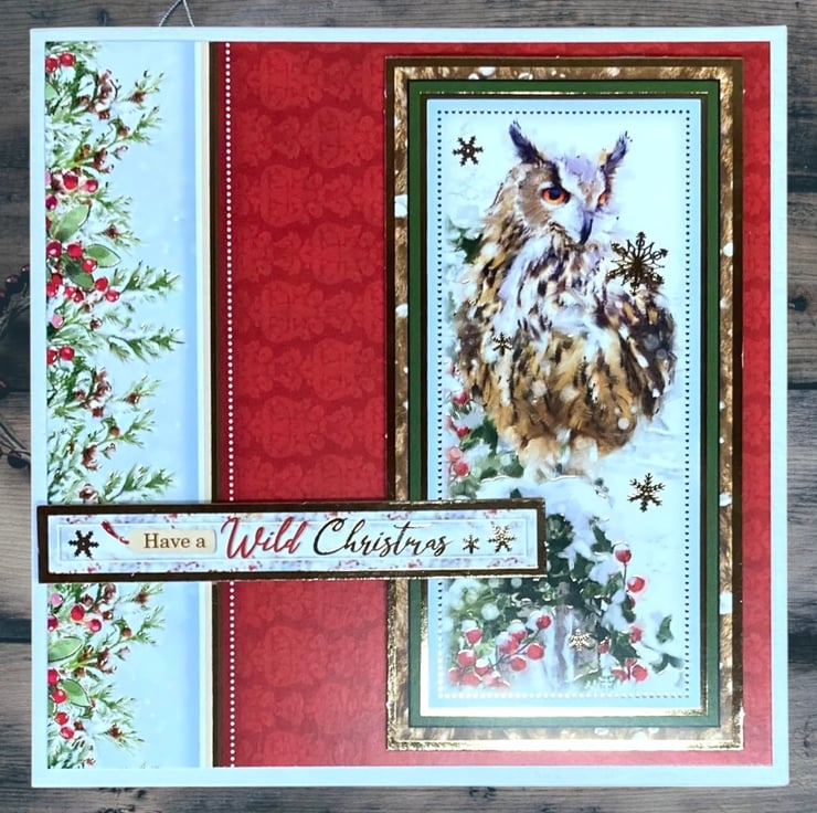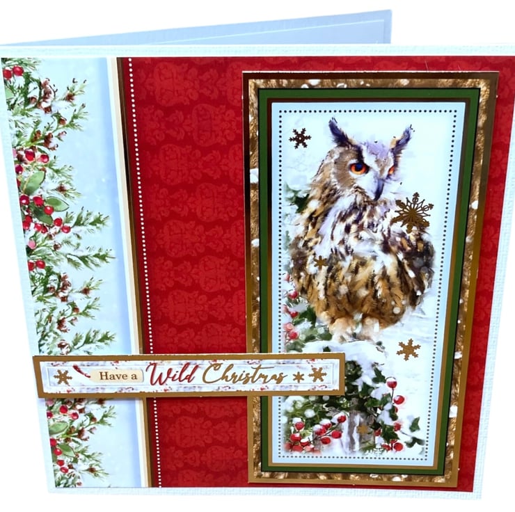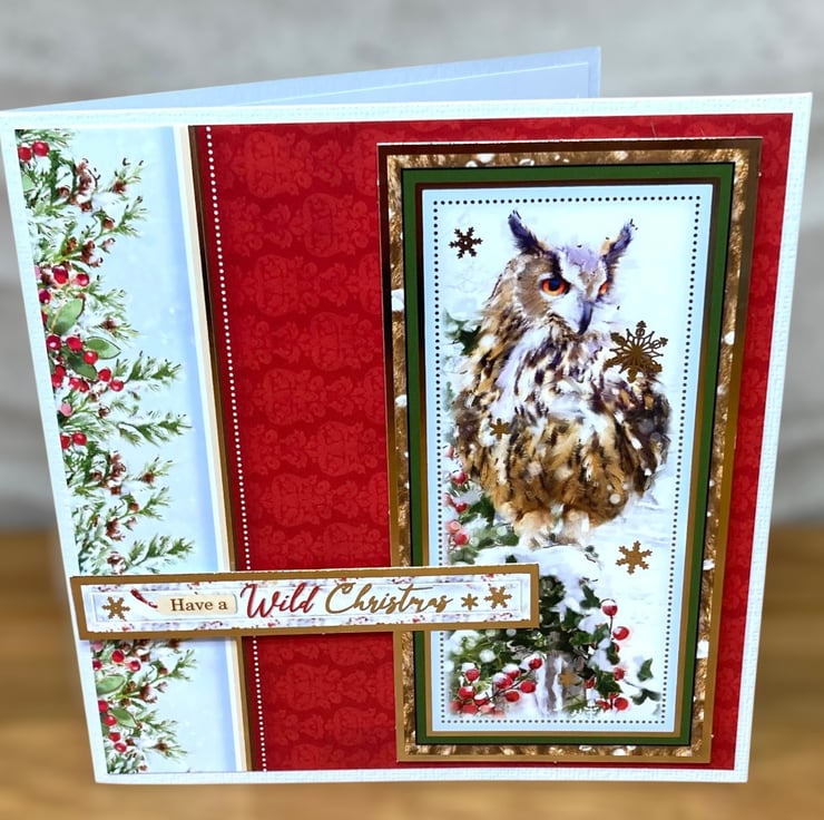 This luxury card features a white linen base overlaid with gold foiled quality card. A large topper with a Long Eared Owl and the words Have a Wild Christmas have been added in 3D.