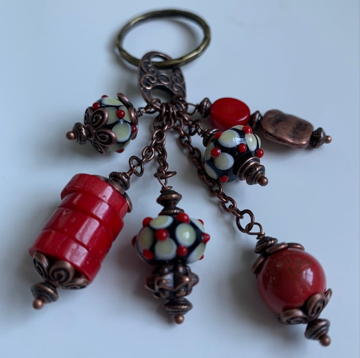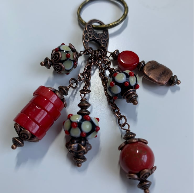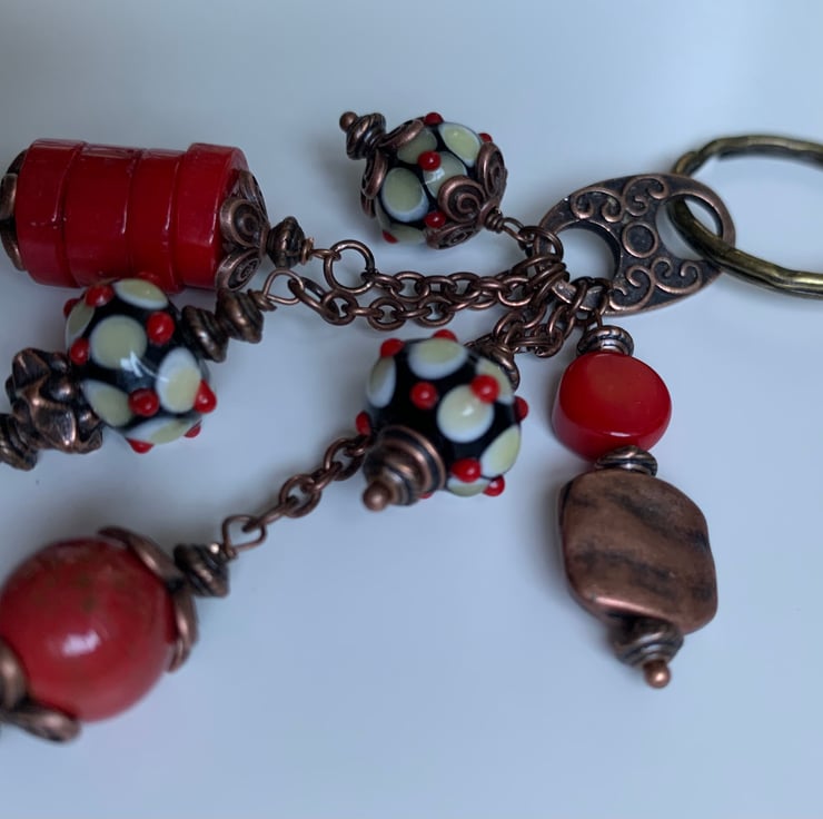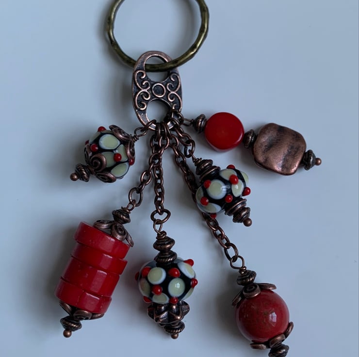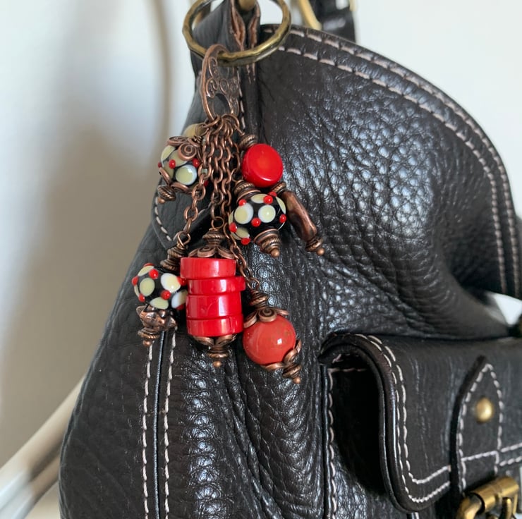 Beautiful Czech glass beads, red coral and ceramic beads make up this copper toned charm. Ideal enhancement for a favourite bag, but could be used to embellish any item.