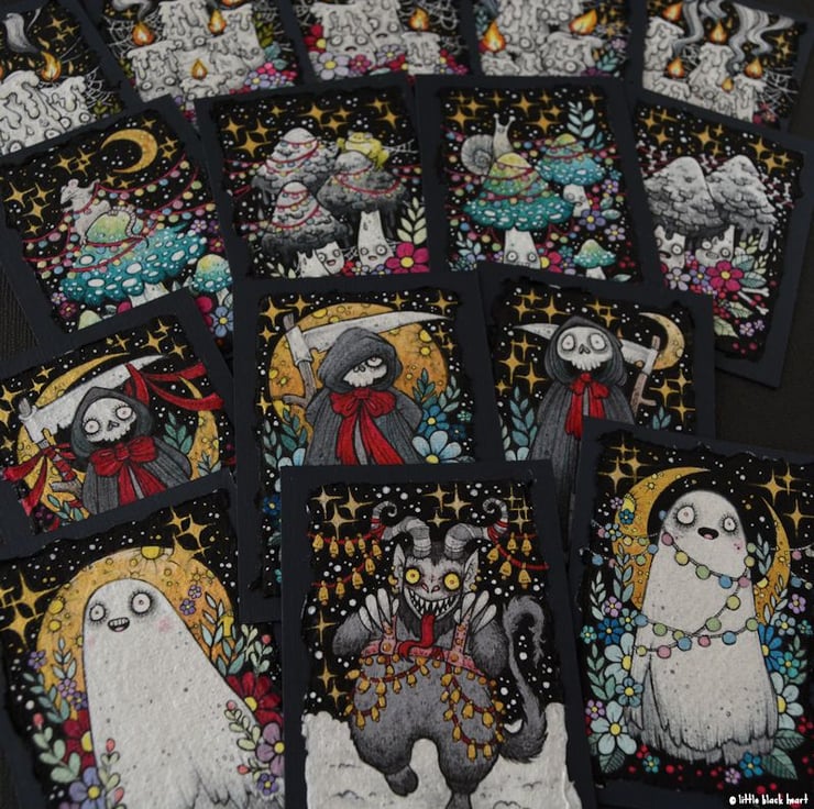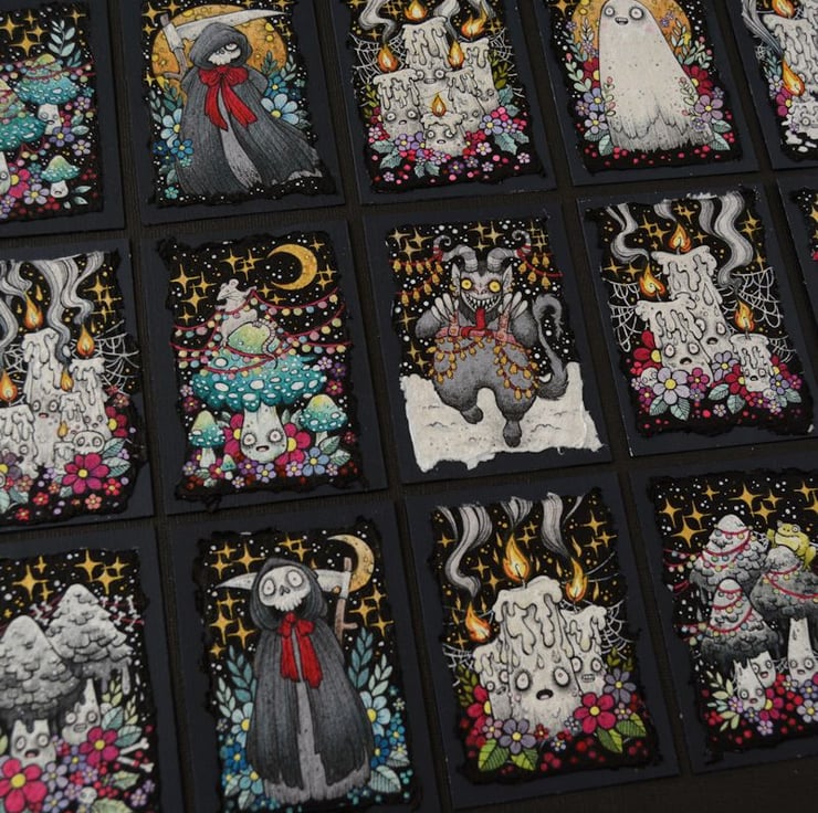this aceo is an original artwork, hand drawn with a tiny 0.05 nibbed pen, then coloured with ink, artists pens and watercolour paints, on indian khadi paper. khadi paper is handmade from recycled cotton rag, it has a lovely textured surface and deckled edges. i have then mounted the illustration onto 300gsm cardstock, hand painted with a paynes grey to create a dark surrounding edge/background.