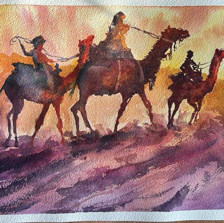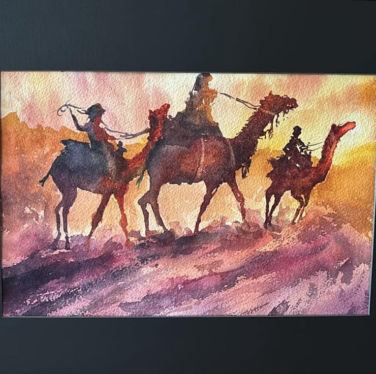 Stunning watercolour depicting camels and their riders travelling across the desert…maybe for you it’s the Wise Men or Magi travelling to see the infant baby Jesus? This original watercolour is on high quality Arches rough paper 10” x 12” in a black frame which complements the painting beautifully. This is such an eye-catching statement piece.