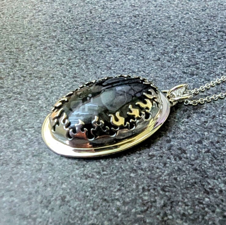 Unusual Picasso Marble gemstone set on a polished sterling silver back plate with burning flames design bezel suspended from an 18" sterling silver chain. Overall measurement just over 30mm length x 25mm width .