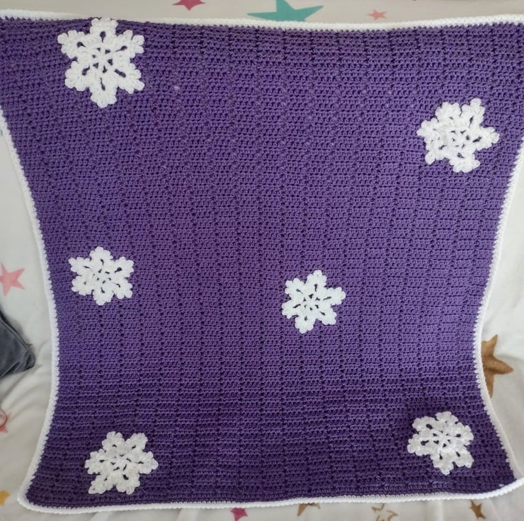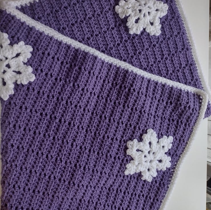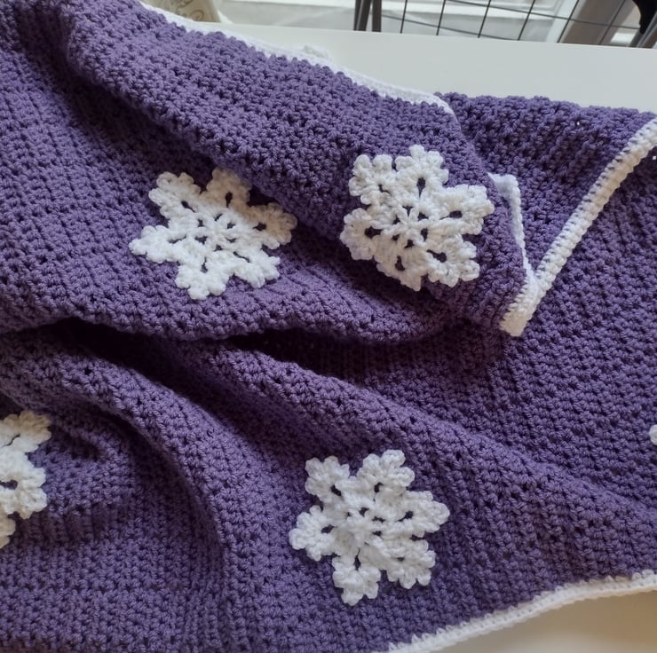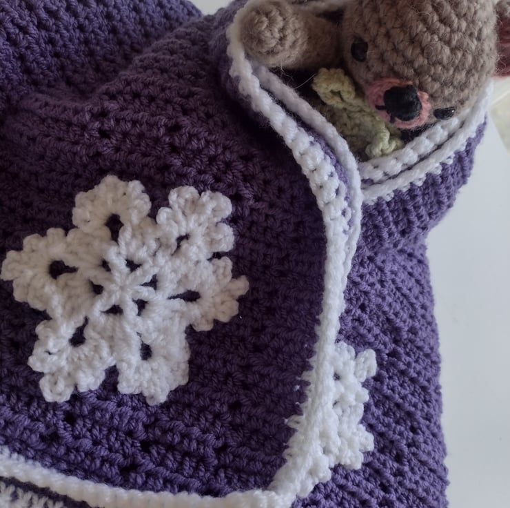 Lovely handcrafted baby blanket in a muted purple, adorned with delicate white snowflake appliques. This cosy, soft acrylic blanket is the perfect size for prams and strollers, providing warmth and style for your little one. Carefully crocheted with attention to detail, the main blanket features a traditional style, edged with brilliant white and finished with snowflakes randomly scattered across. This blanket makes a thoughtful gift for new parents or a cherished keepsake. Just as lovely when used at home as when out and about.