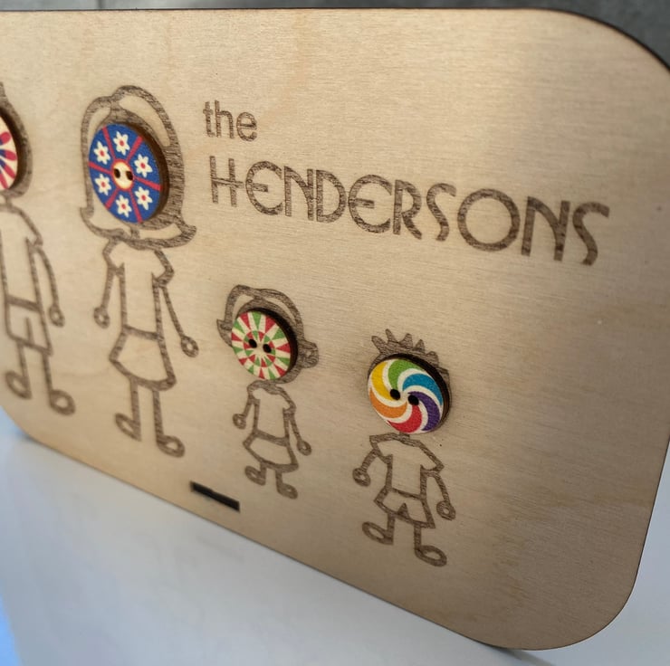 It is made from plywood & has a little stand. You can have upto 6 characters added, adults, children, male, female, cats & dogs. Just add a message to say what you would like & the family name. A funky button head is added for each human character.
