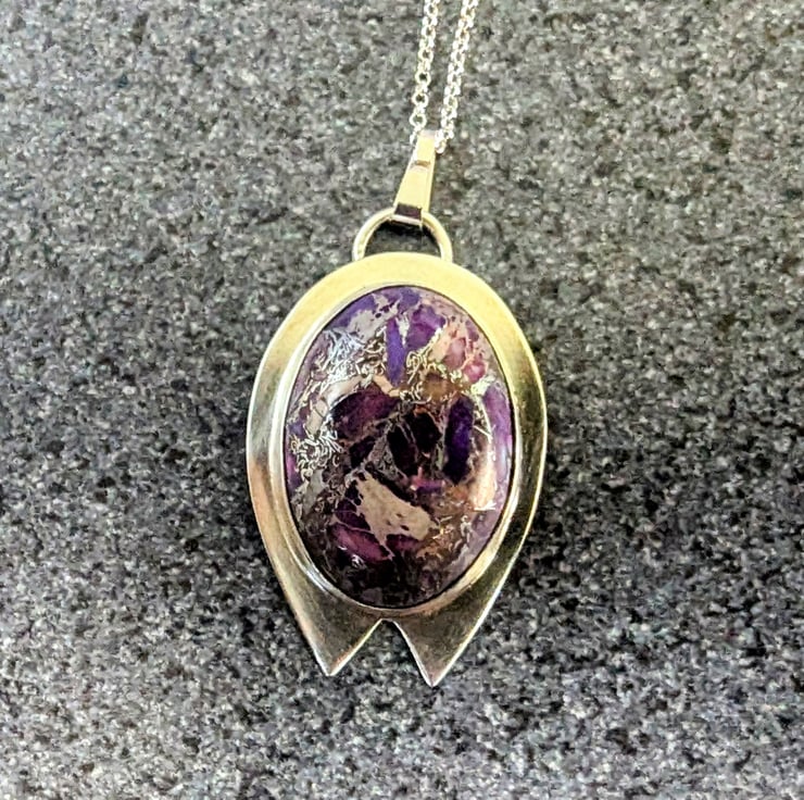 Eye catching purple coloured mixed agate gemstone set on a polished sterling silver back plate suspended from an 18" sterling silver chain. Overall measurement just over 35mm length by 24mm width..