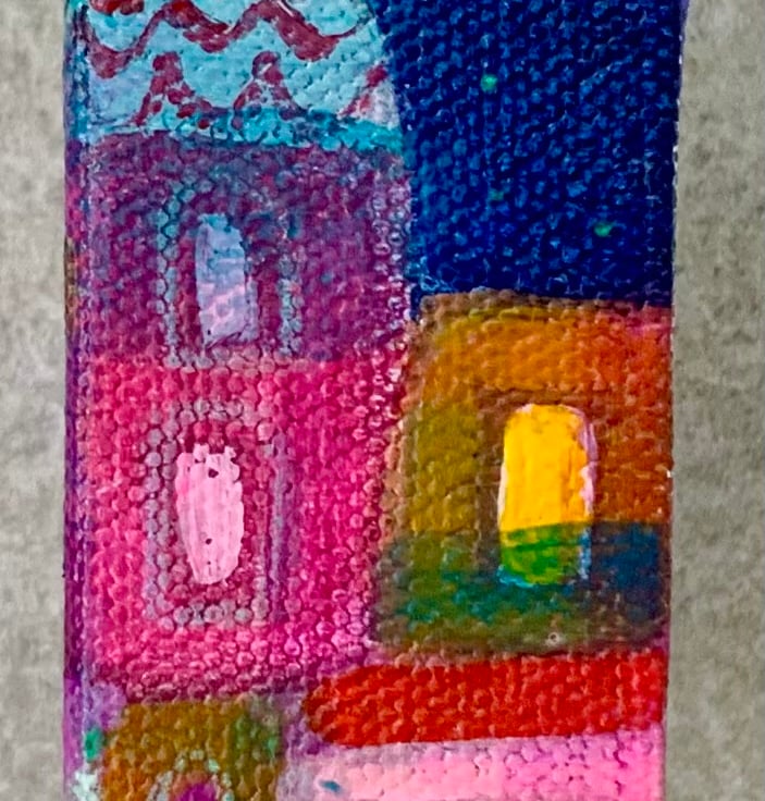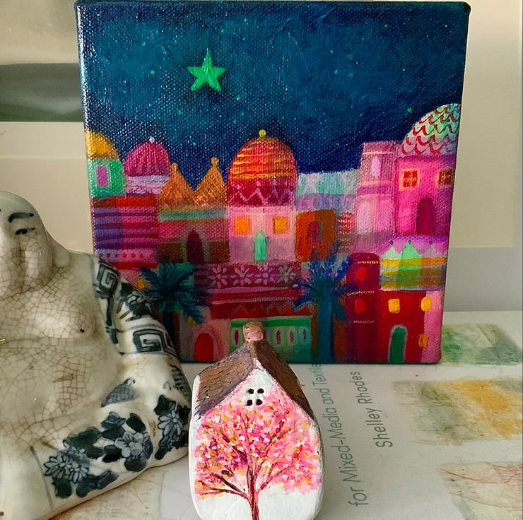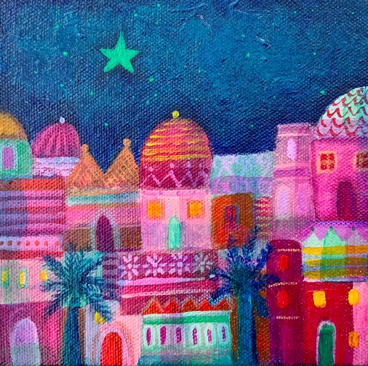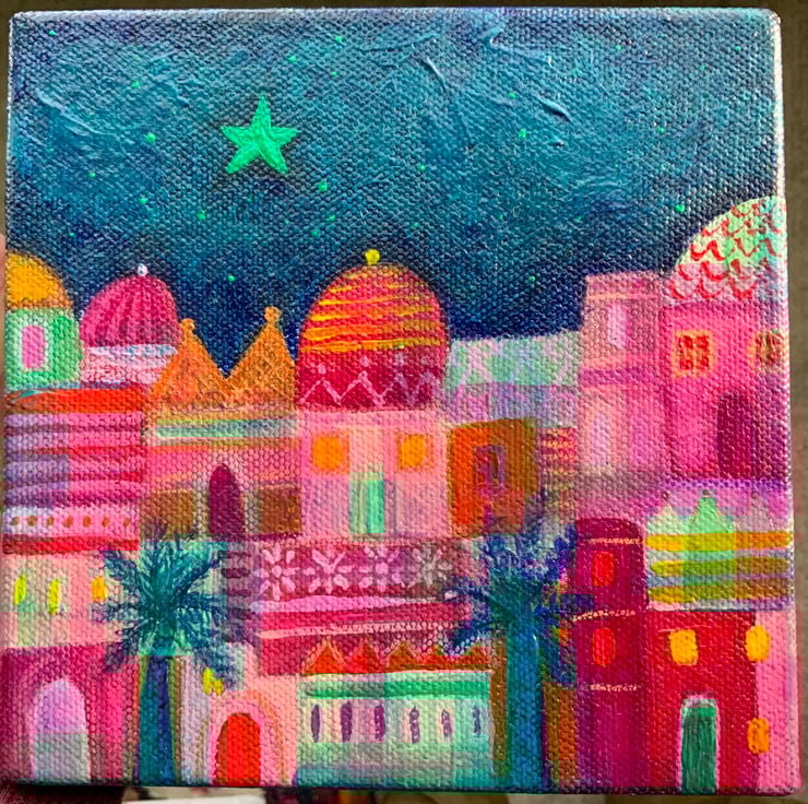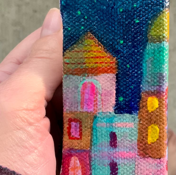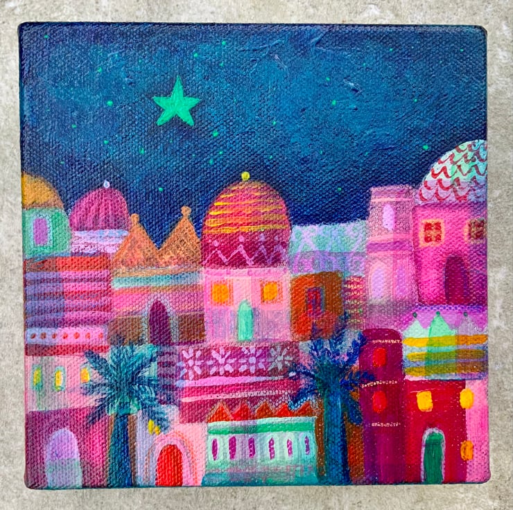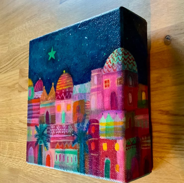 This is an original acrylic painting which I have painted on a 15x15x3.5cm deep edged canvas. It is an imaginary abstract cityscape painted in jewel colours, inspired by the beautiful buildings and colours of Morocco. It is ready to hang with a hook on the back, the painting continues around the sides of the canvas also.