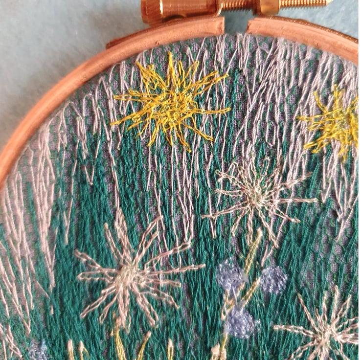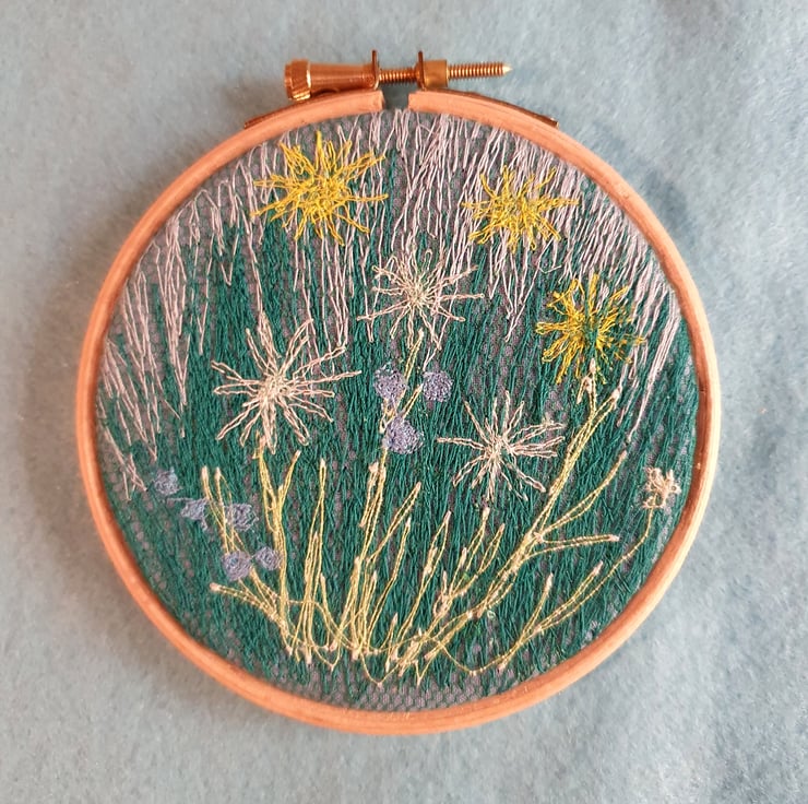 This little wildflower meadow is machine stitched and framed in an embroidery hoop with a wool felt backing. I hope it evokes summertime! This is a one-off and cannot be repeated.