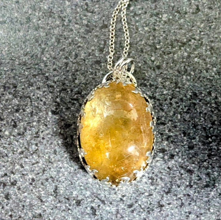 Beautiful honey coloured citrine gemstone set on a polished sterling silver back plate suspended from an 18" sterling silver chain. Overall measurement just over 25mm X 18mm length.