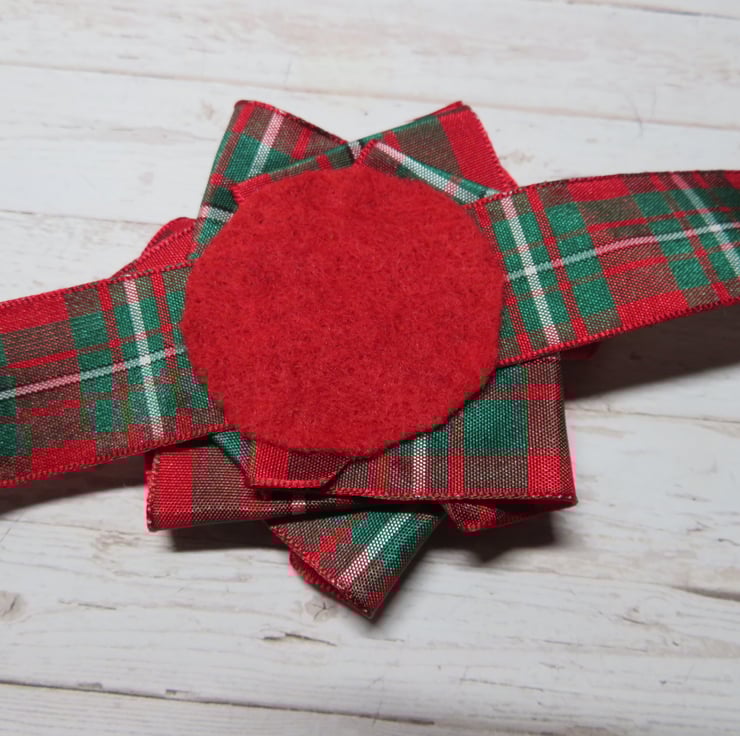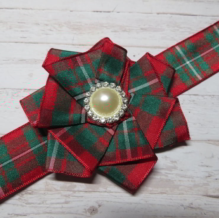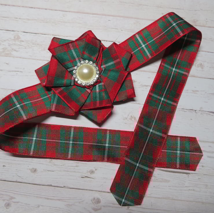 Made with a hand sewn ruffle of wide 40 mm MacGregor tartan ribbon and finished with a round ivory pearl & diamante stud.