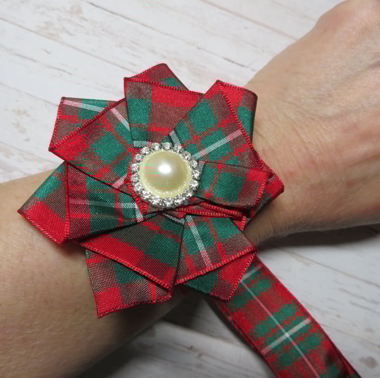 MacGregor Tartan Ruffle Rosette Pearl Wrist Corsage Wristlet Prom Ceilidh