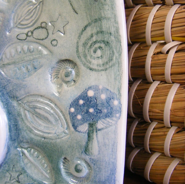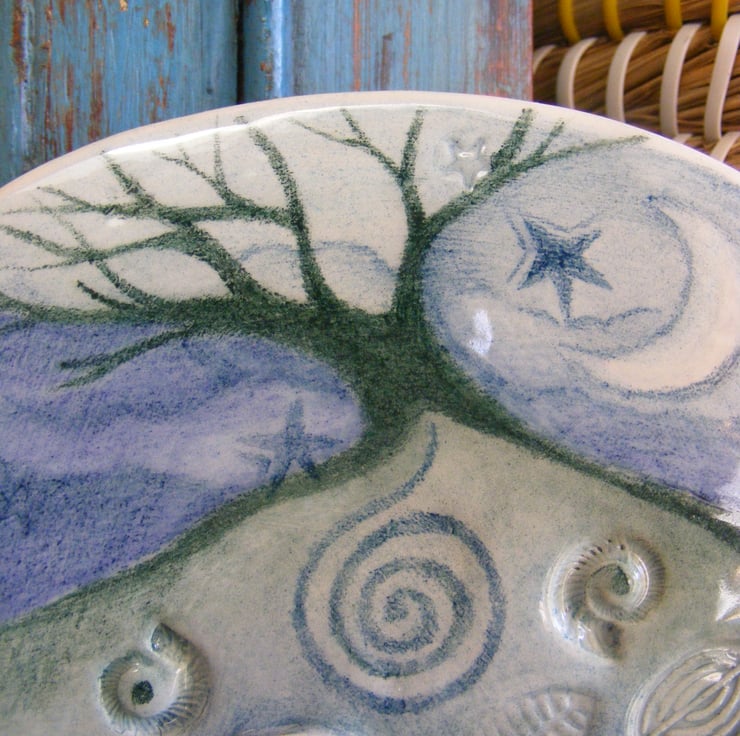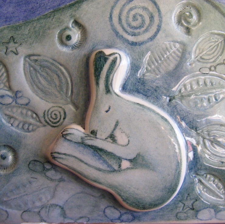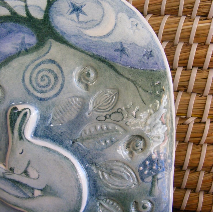 This is my fourth Dreamtime Hare ceramic, each one has evolved and taken on a life of their own. The Dreamtime Hare sleeps nestled in the warmth of the leaves with an Amanita muscaria mushroom and tiny imprinted real ammonites surrounding her. The spiral emanates from the majestic oak representing life in the cycle of nature in which we seek our personal and spiritual growth There are added details to this one in the cloud formation with a bright shining crescent moon and starlit sky. A lot of love and detail has been poured into this gorgeous ceramic, it is a one off original piece and one of my most favourite ceramics to date.