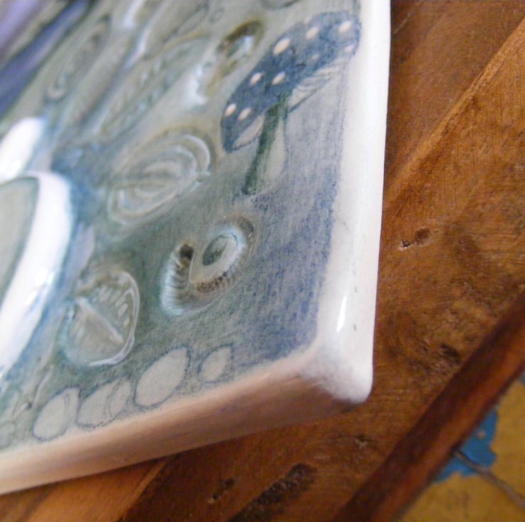 A ceramic wall hanging piece of art with a Hare in sleeping pose dreaming under the mighty oak. Moonlit cloudy starry sky frames the oak and the spiral emanates down the trunk of the tree to the hare sleeping. Surrounded by imprinted leaves, real tiny ammonites and a hand drawn Amanita muscaria mushroom this is a delightful unique bespoke piece of art. Approx measurements are 7" L x 6.5" W. Please note this is not frost proof and should not be placed outside. All work is hand drawn and no use of ceramic transfers.Hook attached to the back for hanging. This item is bespoke & therefore may have slight imperfections in the glazes as it is a unique handmade piece.