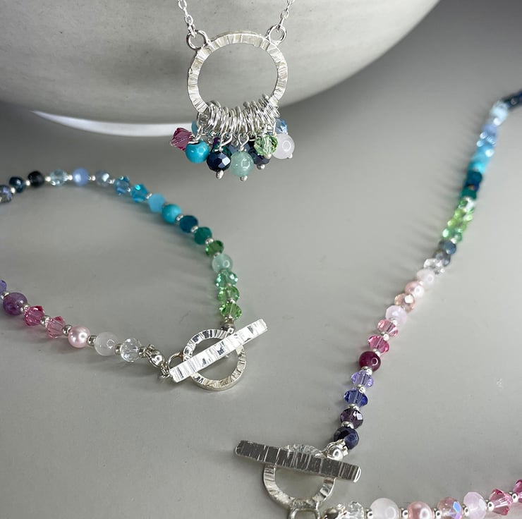 For a kaleidoscope of glittering colour, the Rainbow cluster necklace is the perfect addition to your necklace collection. A mix of texture, shape and colour is combined in this handmade piece, with an array of faceted crystal and semi precious beads. Each bead is hung from tiny rings which are suspended from a large 18mm recycled Sterling silver circle with hammered bark texture. The fine chain and circle hang at 16" / 42cm length. Also available in other colours and can be made in alternative lengths.