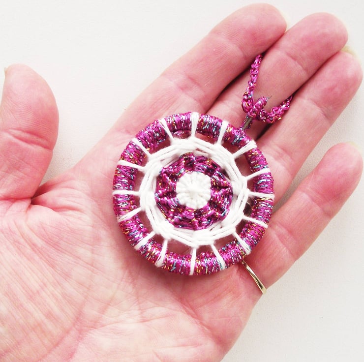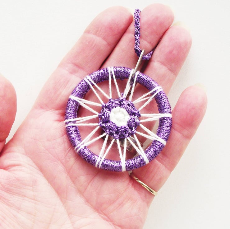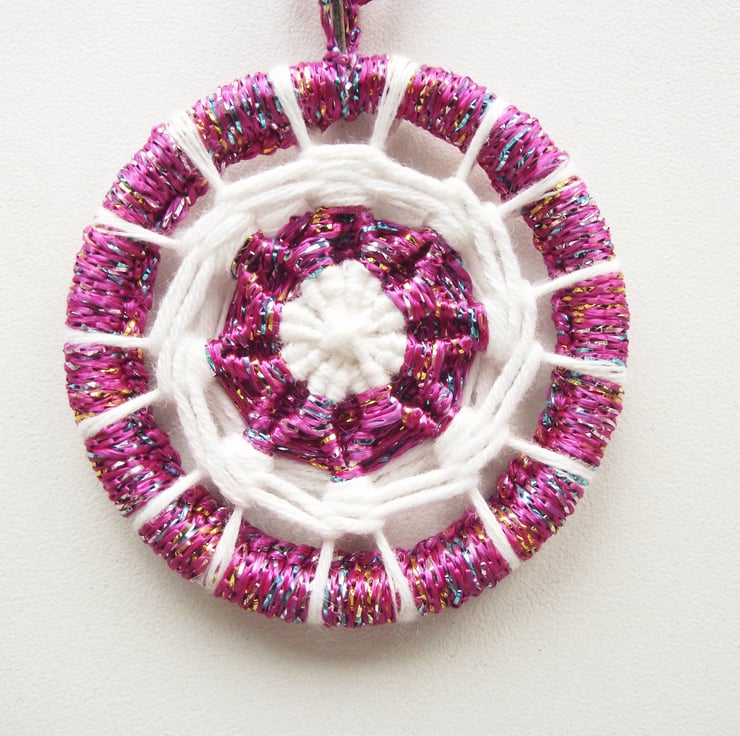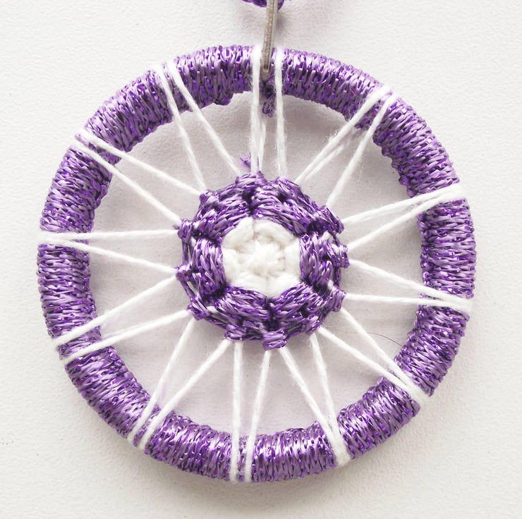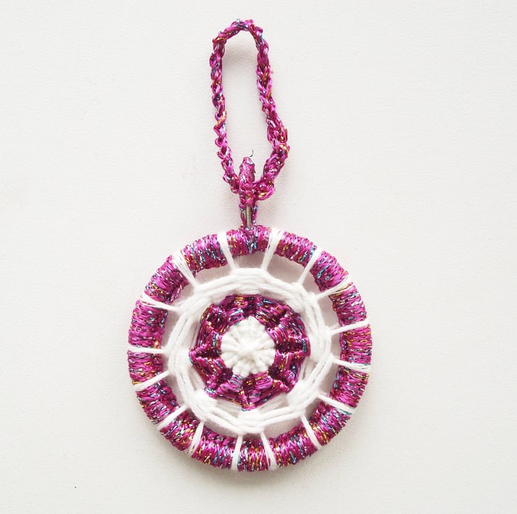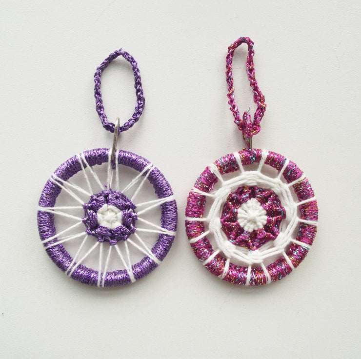 I made these unique Christmas tree decorations using the traditional Dorset button technique, intricately working sparkly pink and sparkly purple thread and white cotton thread around repurposed metal curtain rings. I added hanging loops in the sparkly threads.
