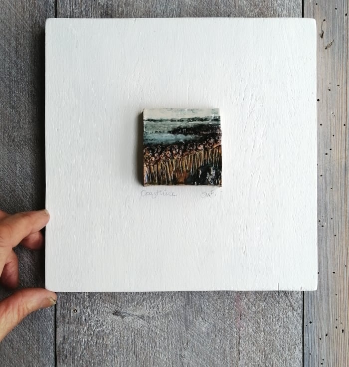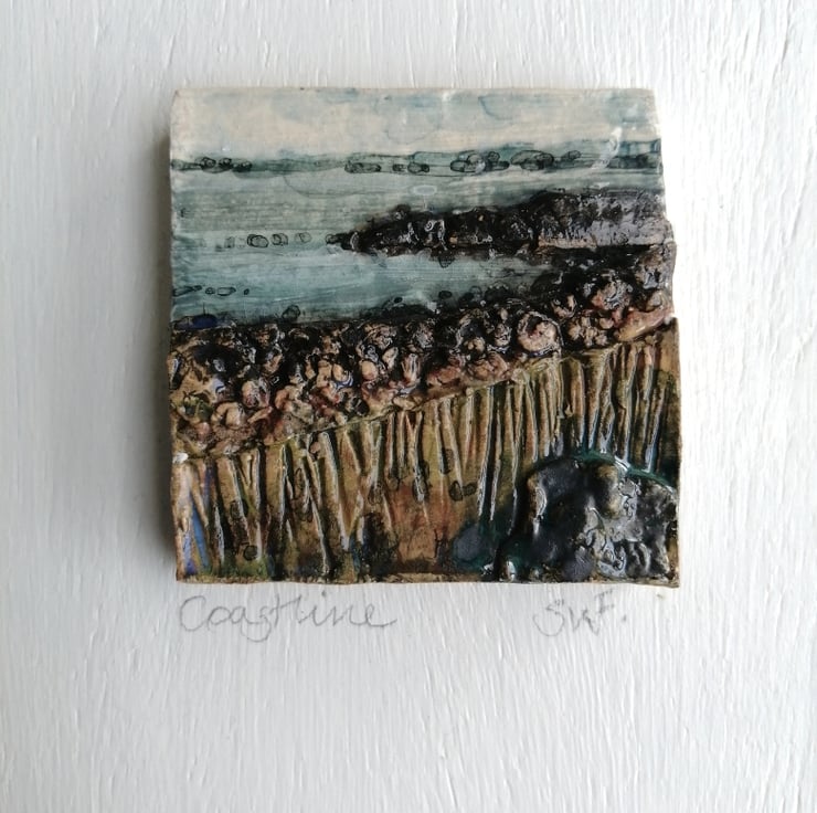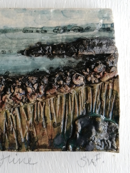 This ceramic, low relief landscape, the smaller version of my larger ones. Has been created by applying and layering clay textures, stamping and scratching into the wet clay, before painting liquid clay slips onto areas, starting to define areas of sea and sky.
