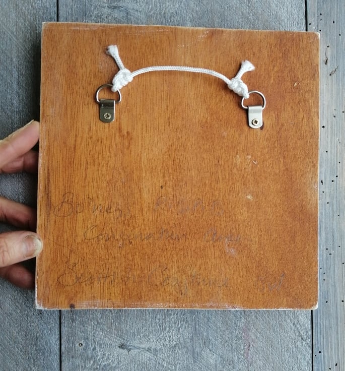 This ceramic landscape comed ready to hang and measures approx 5.5 cm square with a depth of approx 1 cm, mounted onto a wooden frame made from up cycled wood, measuing 19.5 cm square, depth of 1 cm, painted in satin Moonlight White.