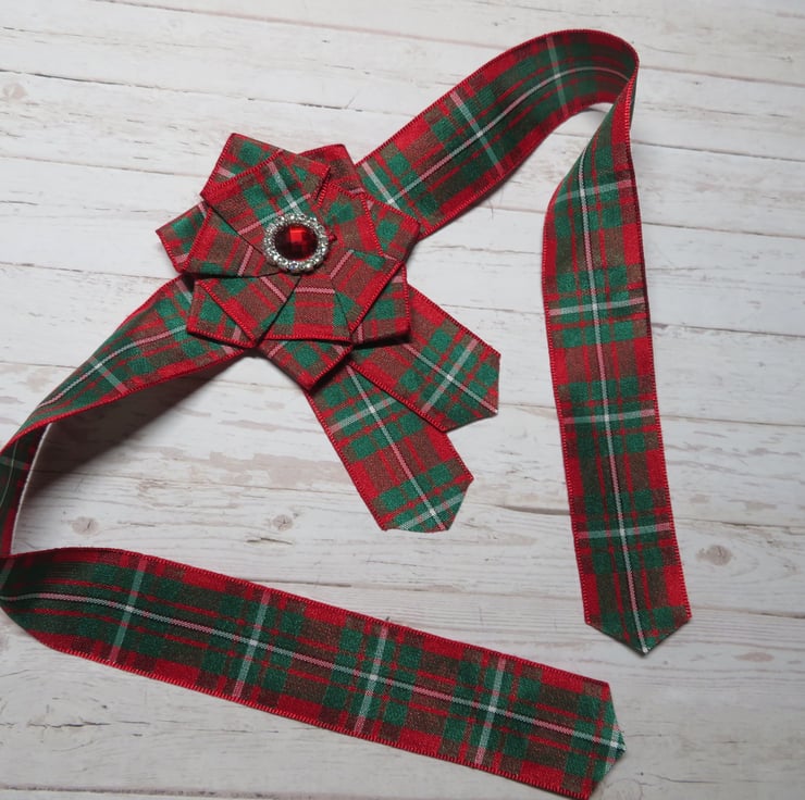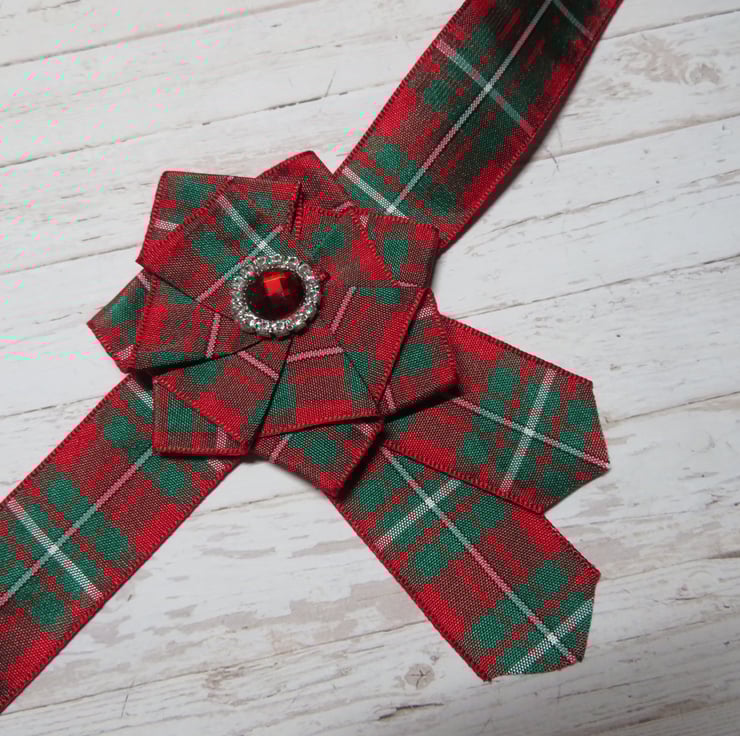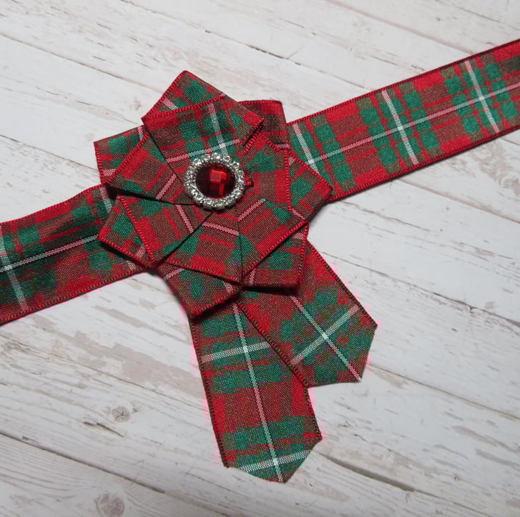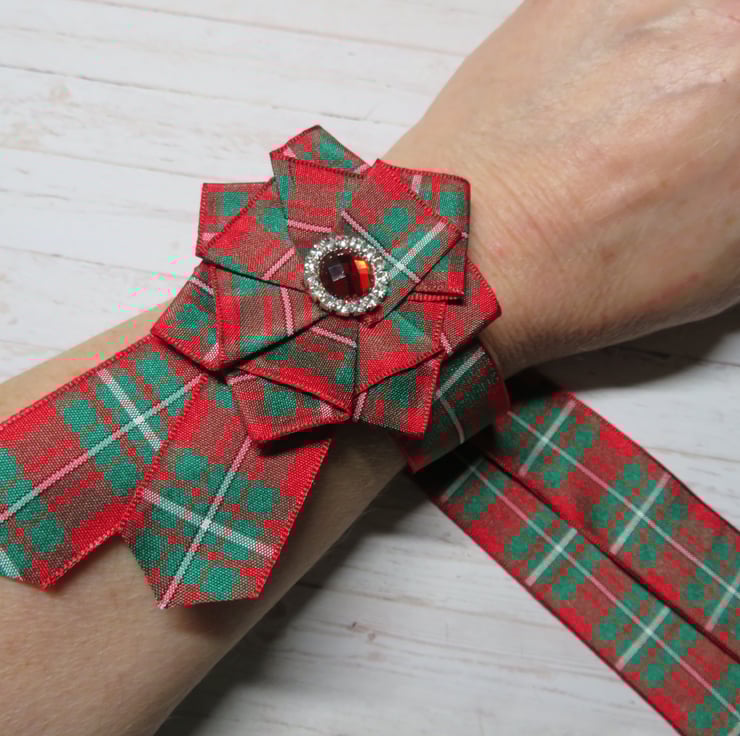 Made with a hand sewn ruffle of MacGregor tartan ribbon with wide ribbon shaped trails and finished with a small round red crystal & diamante stud.