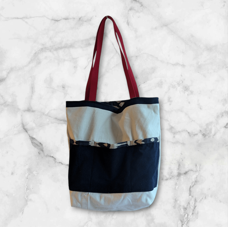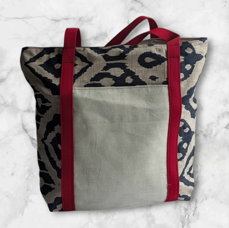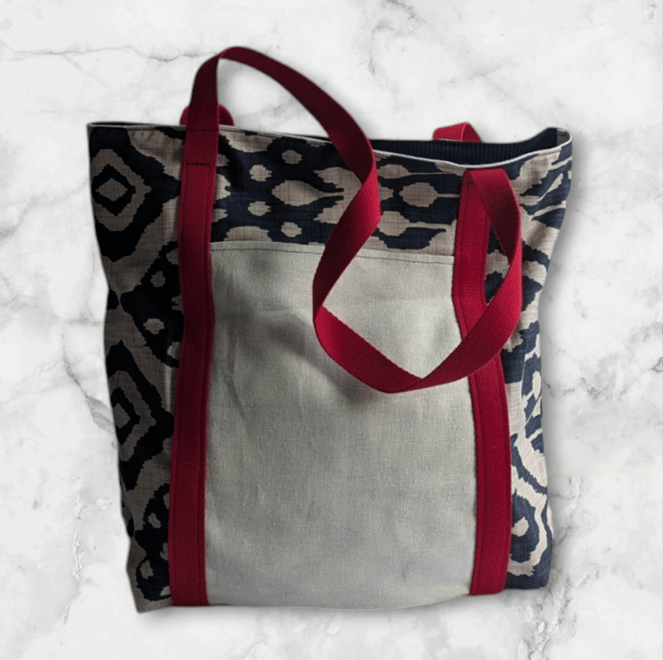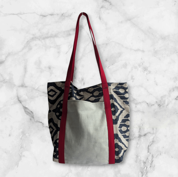 Crafted from luxurious deadstock linen, this ethically sourced tote combines sustainability with timeless style. The striking blue pattern is complemented by bold red webbing shoulder straps, making it both functional and eye-catching.