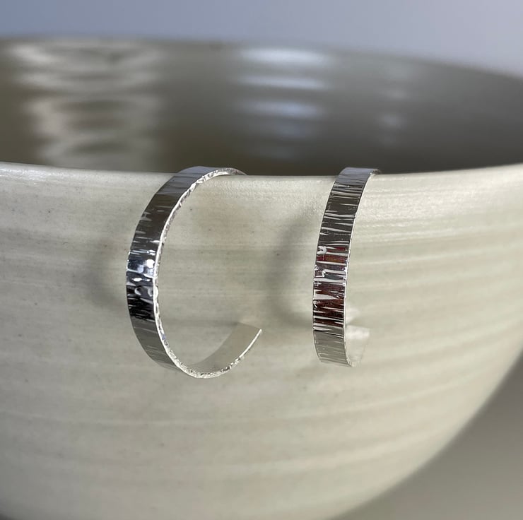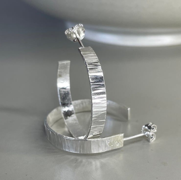 Looking for statement Hoop earring? These 28mm diameter pair will perfectly fit your look. Made from recycled Sterling silver with modern bark effect texture added to the surface of the hoops. Due the handmade nature of these hoops, each pair can vary in width from 4mm - 5mm wide. Smaller diameter sizes available to order.