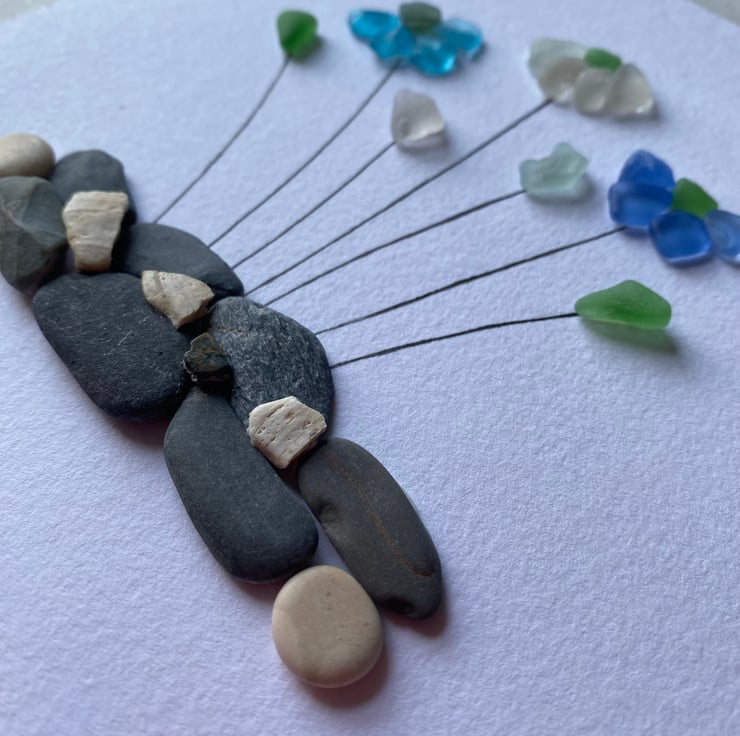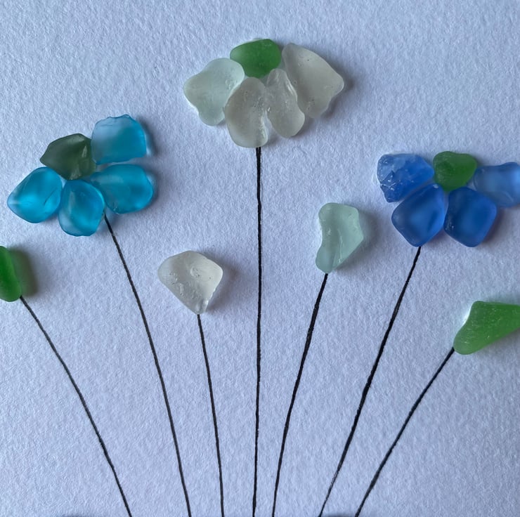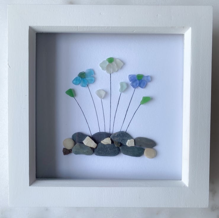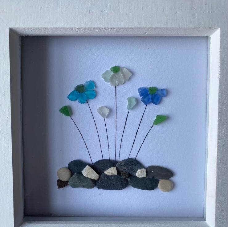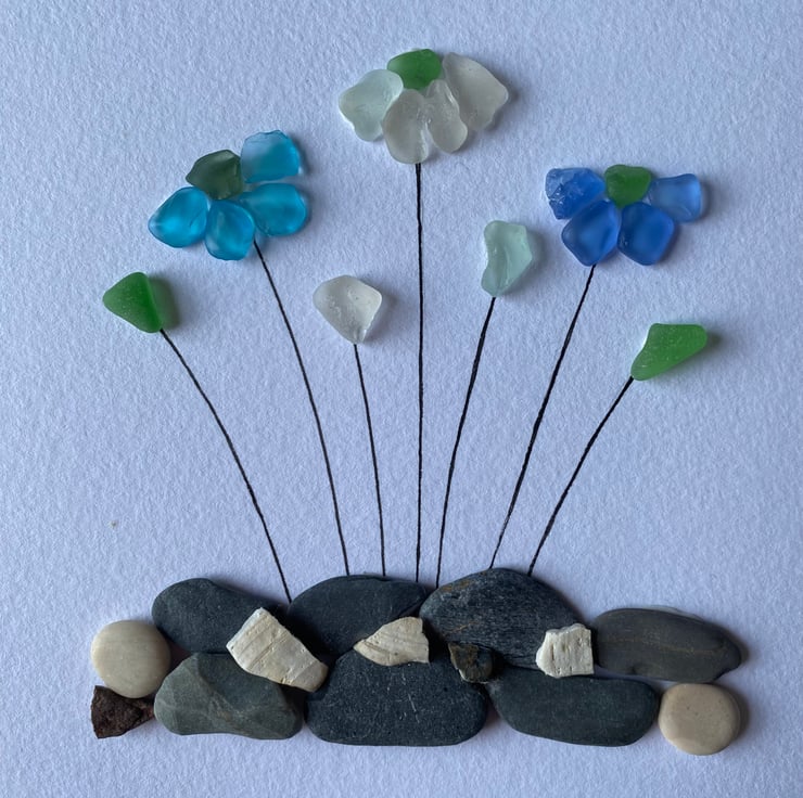 A pretty floral design made with sea glass, shells and pebbles. This piece features some pretty pieces of rare blue sea glass.