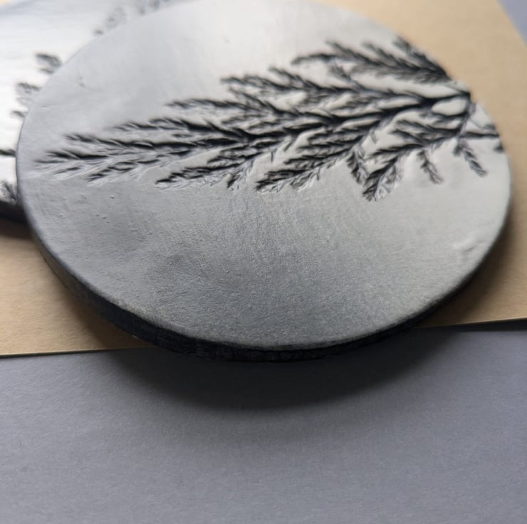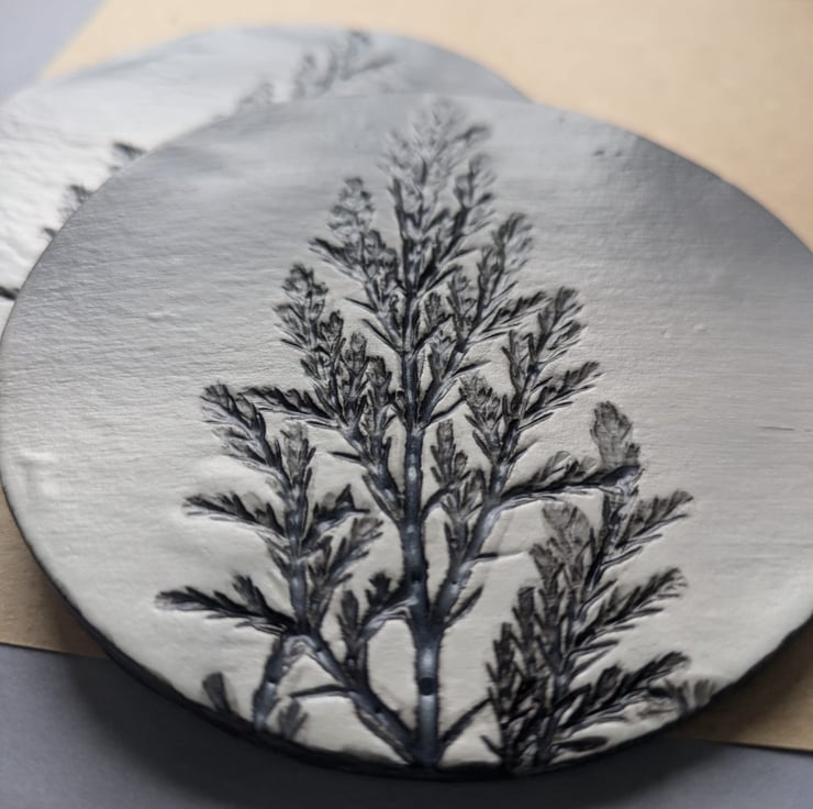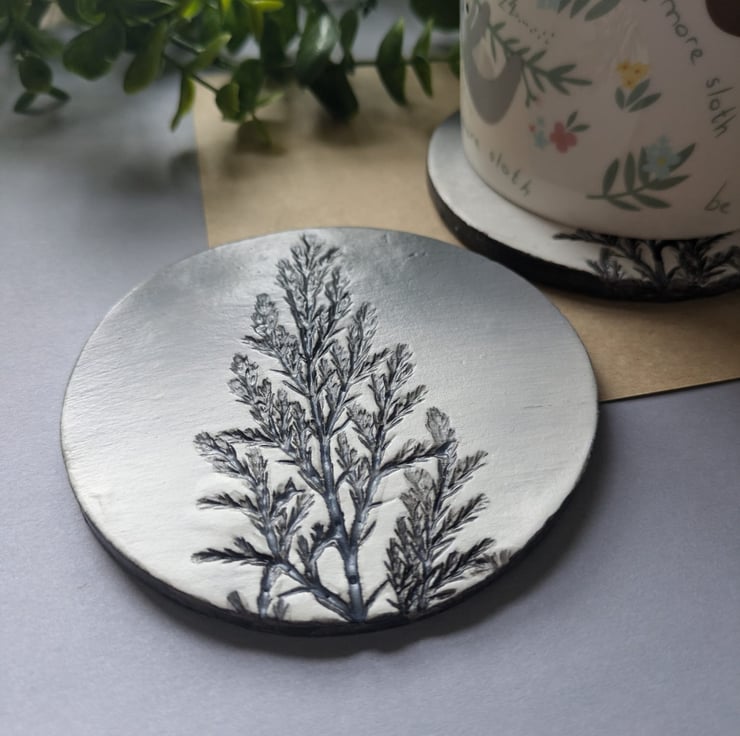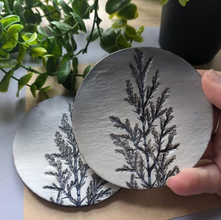 I use conifer to imprint onto the clay. I then cut the coasters to size and allow to dry for 3 days. Once dry, I paint the coaster in an ombre affect using acrylic colours. Then I paint the leaf imprint and the edges in a complimentary acrylic colour. Once the paint has dried I seal the pieces with a ceramic gloss and apply foam feet to the underside. They can be used for hot and cold drinks.