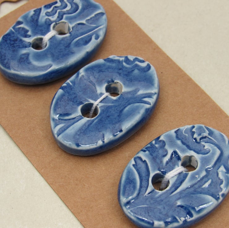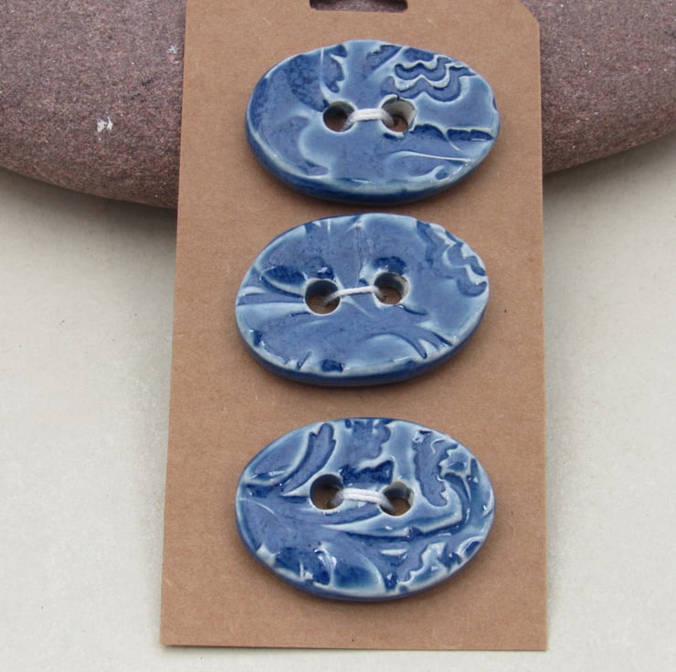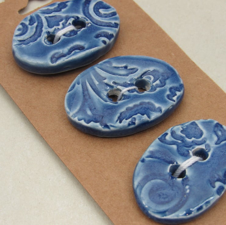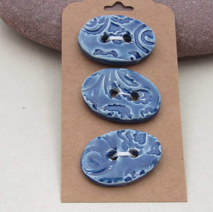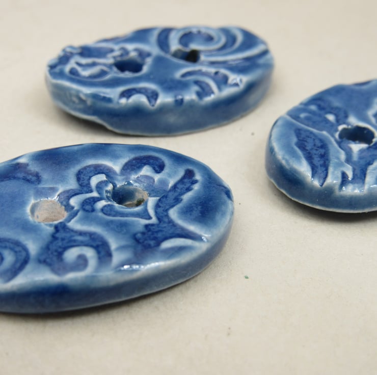 3 medium sized stoneware buttons, with a pretty brocade motif printed into the upper face.