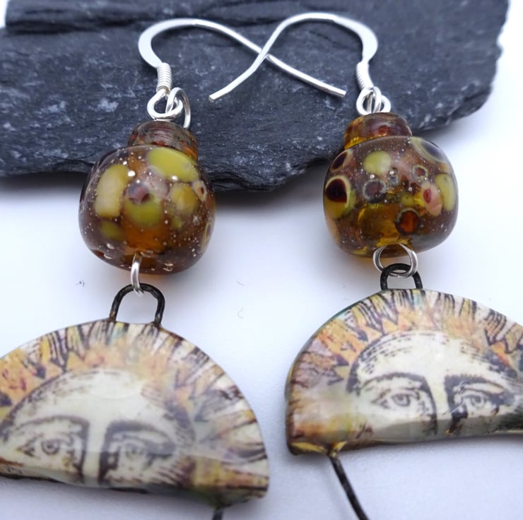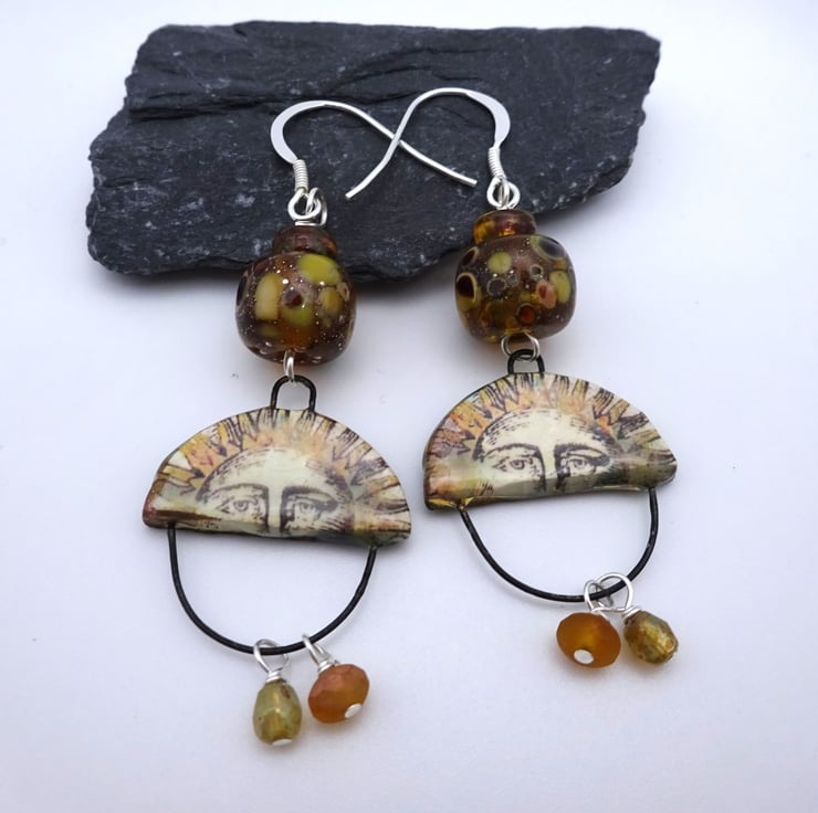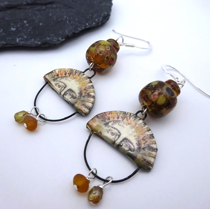 A pair of earrings made with sterling silver ear wires, handmade lampwork brown and silver glass beads, handmade ceramic sun charms and small orange glass beads.
