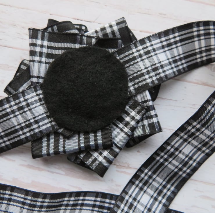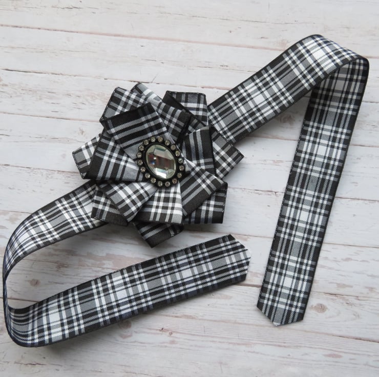 Created with a hand sewn ruffle of wide 40 mm Menzies tartan ribbon and finished with an oval clear crystal & diamante cabochon.