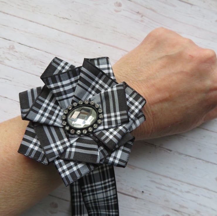 This cute Menzies tartan wrist corsage is ready made and can be posted straight away.