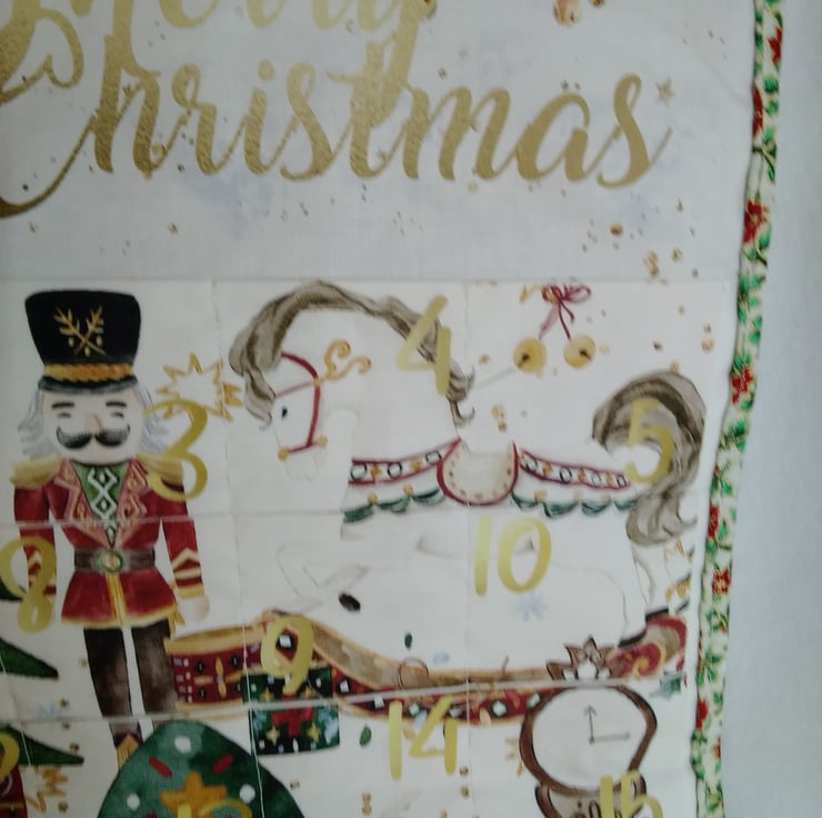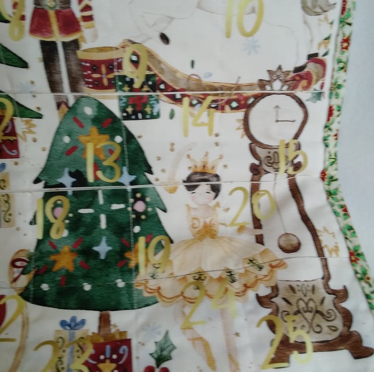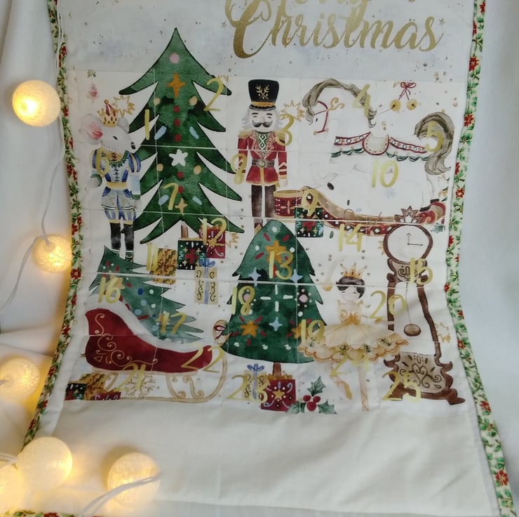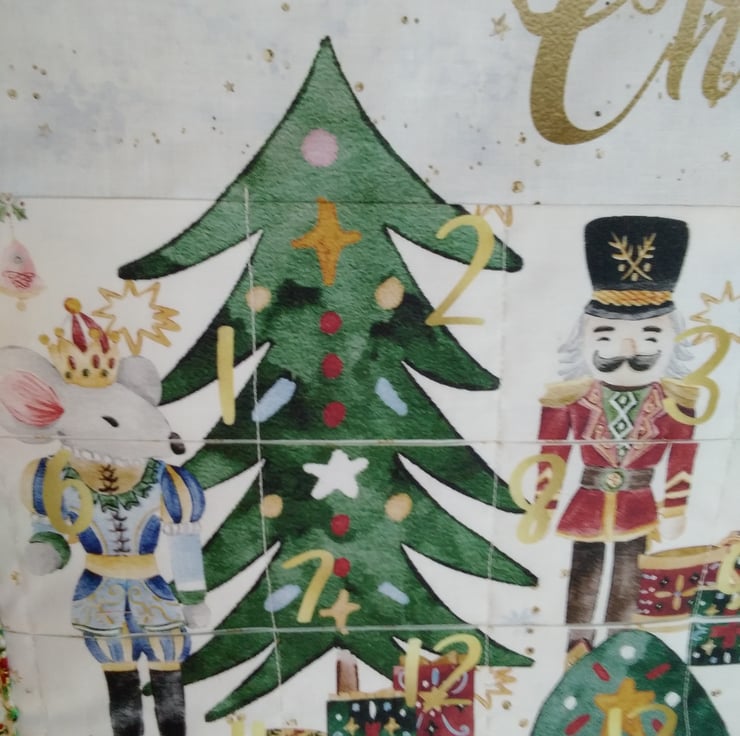 Stunning cotton fabric advent calendar with NUTCRACKER THEME shown in beautiful illustrations, using warm colour pallette and gold highlights. There is a pocket SEWN into place for each day leading up to Christmas ready for you to pop a treat /sweet inside.