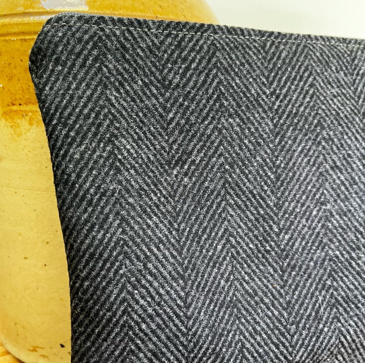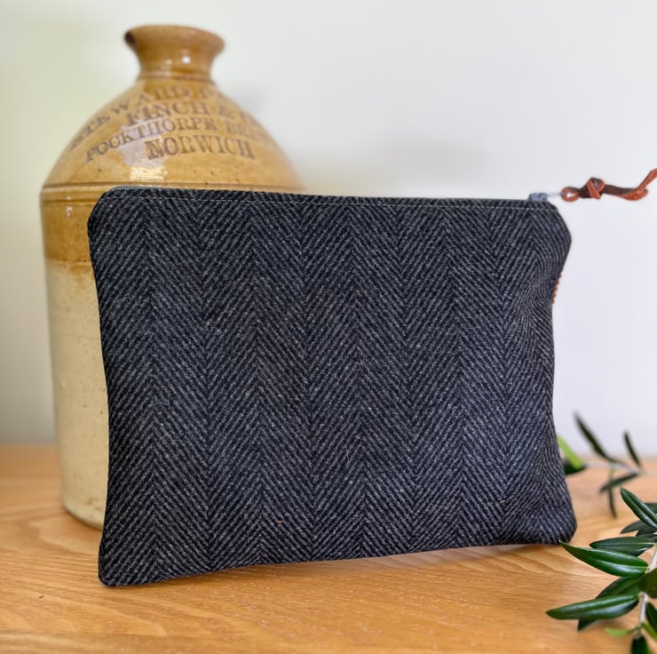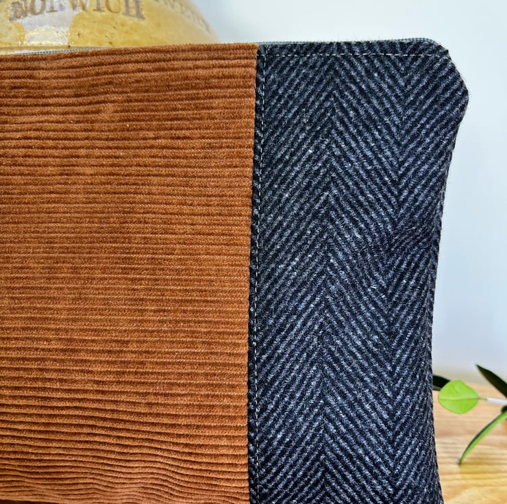 One of a kind zip pouch made from fabric sample swatches - brown corduroy and dark grey herringbone wool-rich fabric.