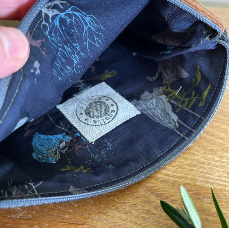 The pouch is fully lined with dark blue cotton with an abstract design of waterfalls and trees.