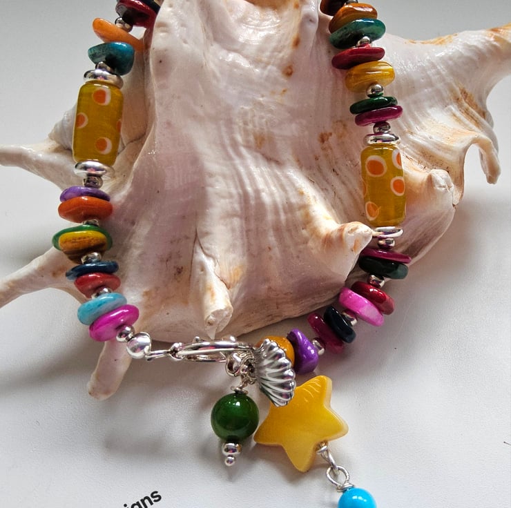 For the main construction professional coated stainless steel jewellers wire has been used for added strength and lasting durability, finished off with a quality silver plate round toggle style clasp. One charm is a silver tone shell. Between the beads are 2mm silver plated and rondelle shaped spacer beads for added sparkle during wear.