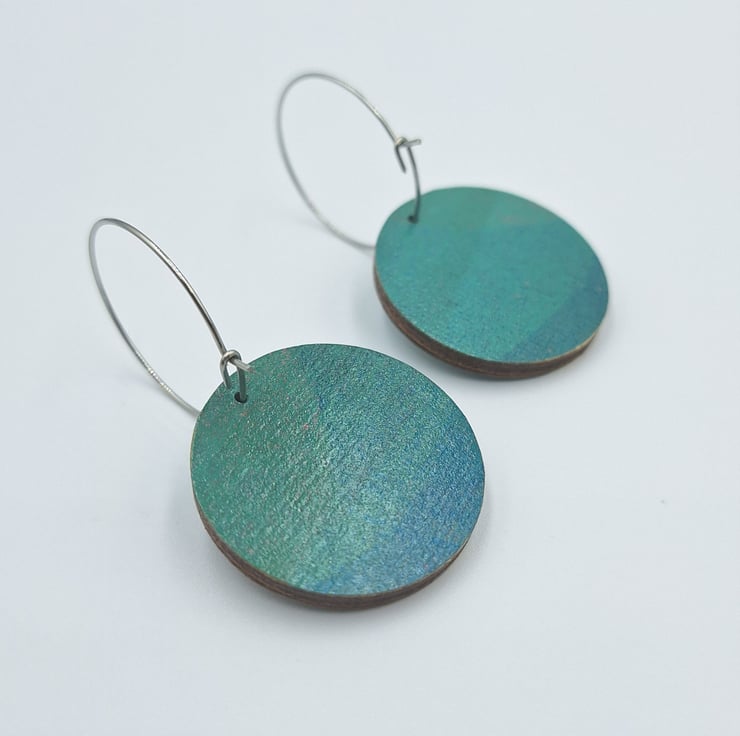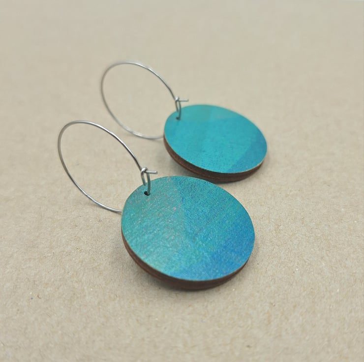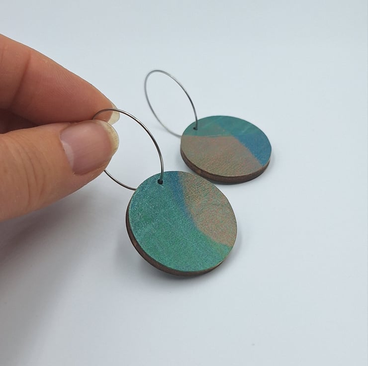 Round, wooden, hand printed hoop earrings in brown pink, turquoise and blue-green.