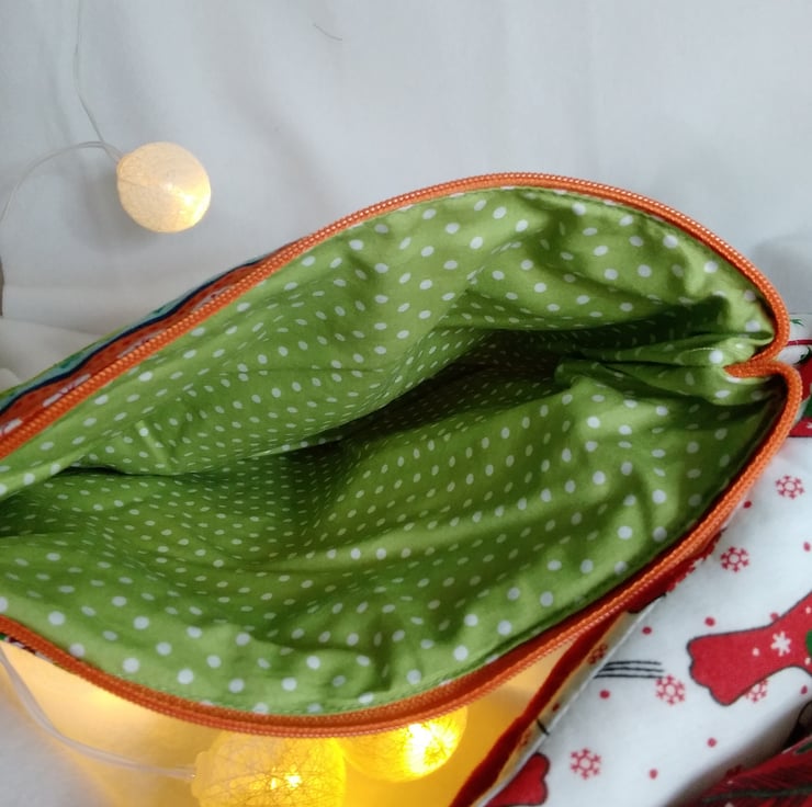 A QUIRKY POUCH IN THE SHAPE OF A SHORT CHRISTMAS STOCKING...WITH A ZIPPED CLOSURE ACROSS THE TOP.