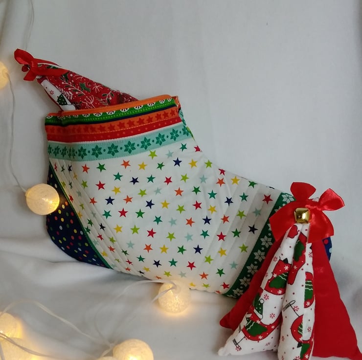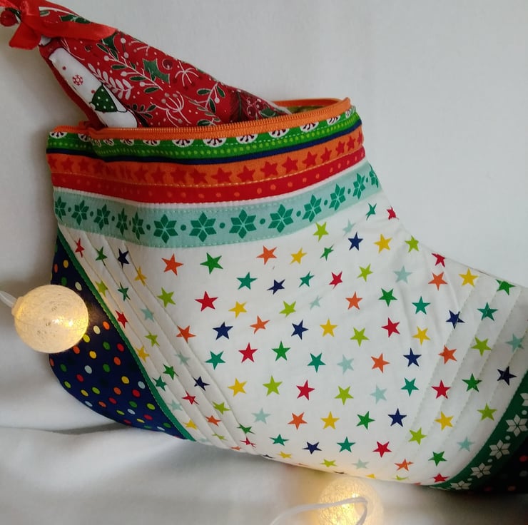 In the process of making gift bags and Christmas stockings I found I had a spare section of fabric. In the spirit of finding a purpose for any unused materials, if I can ( I do try, honestly I do ) I had a think and decided on a stocking boot ,added a zip to make it a handy pouch . I do love it when quirky little projects work out !