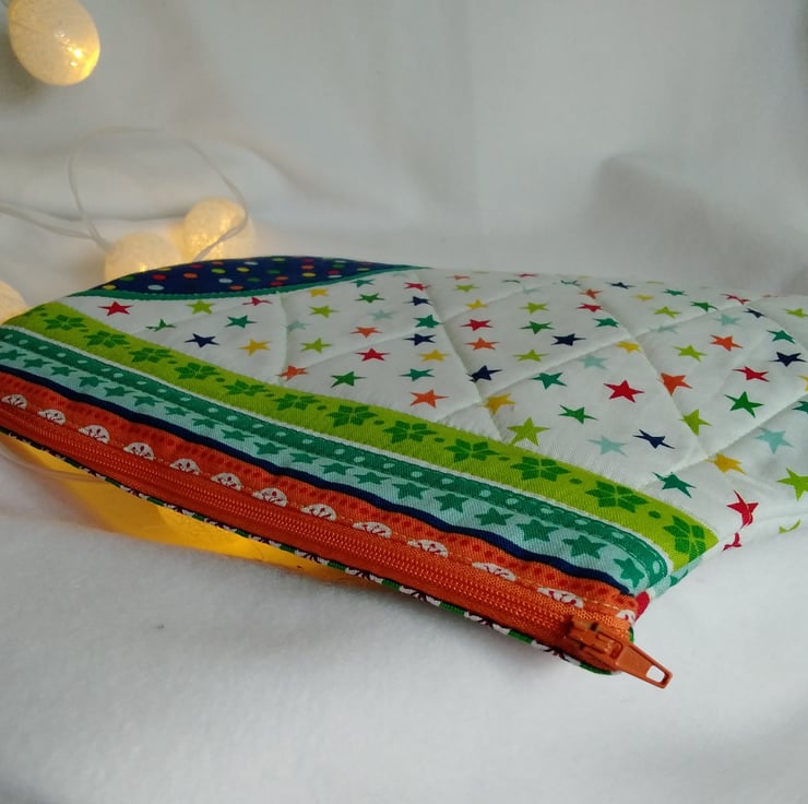 MADE USING BRIGHT COTTON FABRIC WITH PRIMARY COLOURED STARS ON A FRESH WHITE BASE AND ZINGY STRIPES AROUND THE EDGE.