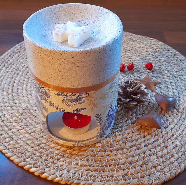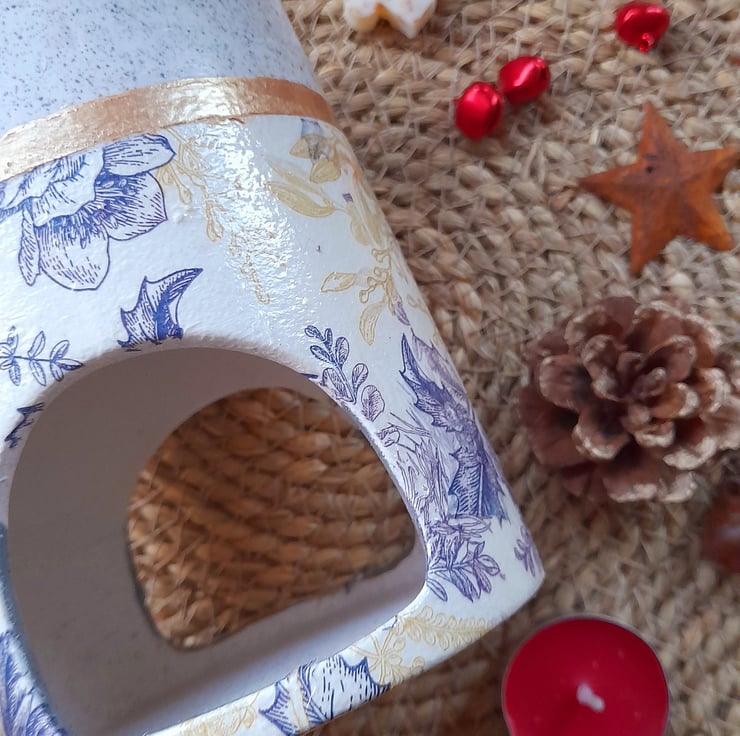 With a modern look this melt burner now has the addition of Blue Christmas Florals with a flourish of Gold along the bottom half & a speckled grey above the gold line.