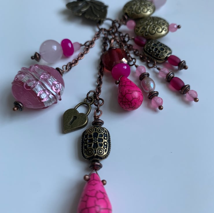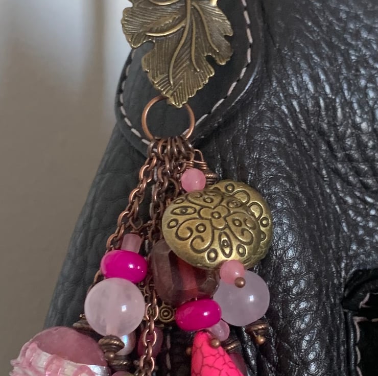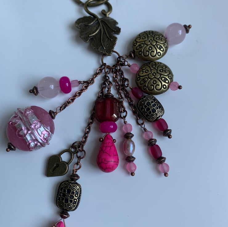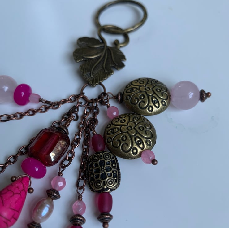 A beautiful charm made up of a selection of pinks and copper tones. This pretty charm incorporates a vine leaf. Beads I have used include rose quartz, glass foil, freshwater cultured pearls, pink howlite and some pink jade. Easily attaches to your bag (or anywhere else) by a traditional key ring.