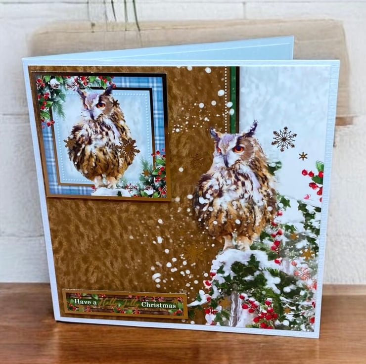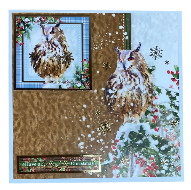 This luxury card features a white linen base overlaid with gold foiled quality card. A large topper with a Long Eared Owl and the words Have a Jolly Holly Christmas have been added in 3D.