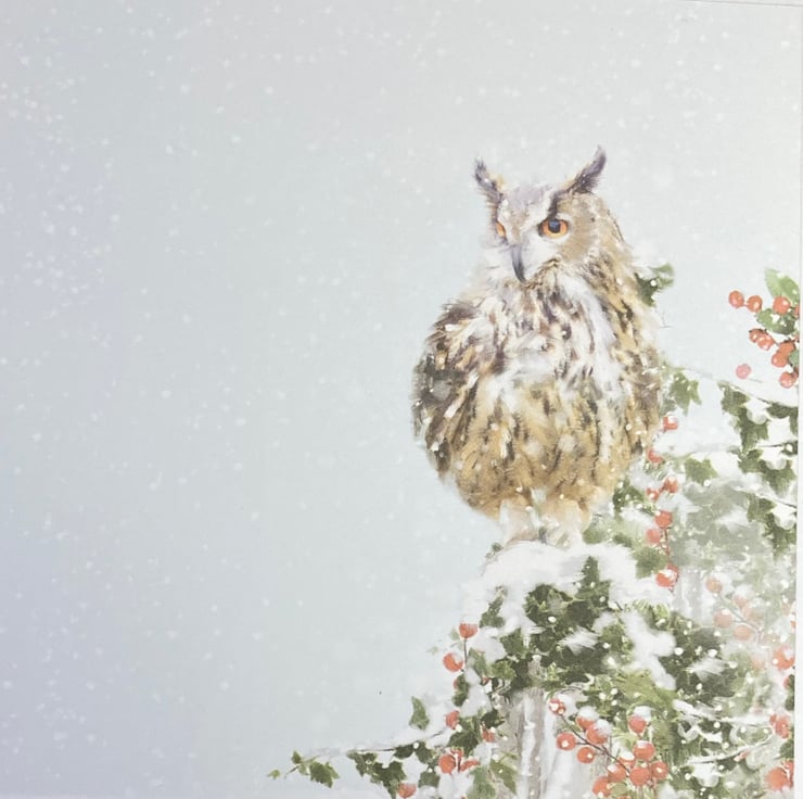 This luxury Christmas card features a Long Eared Owl in a lovely snowy scene with holly and berries.