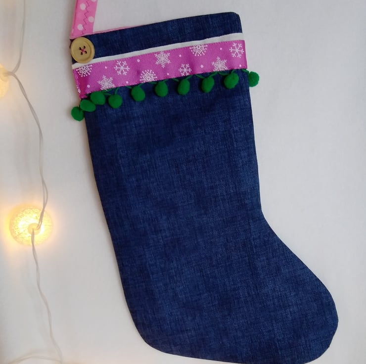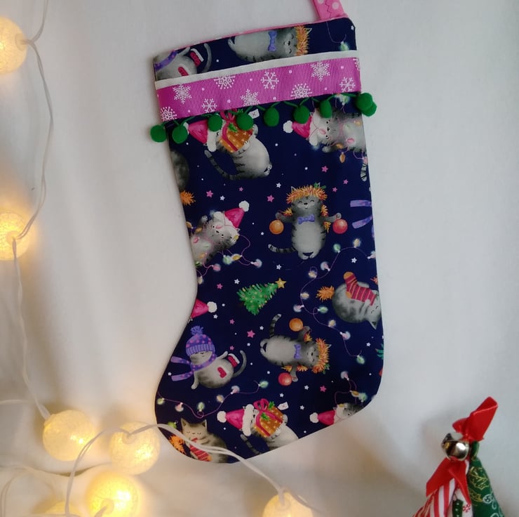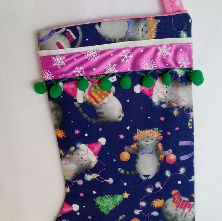 A very cute Christmas cat themed stocking. Quilted and plush in navy and pink quality fabric showing kittens with trees and tinsel and string lights . The cuff is embellished with a pink ribbon and pom-pom trim. This is an adorable little stocking for a little someone who loves cats or gift it to your furry friend filled with cat treats .