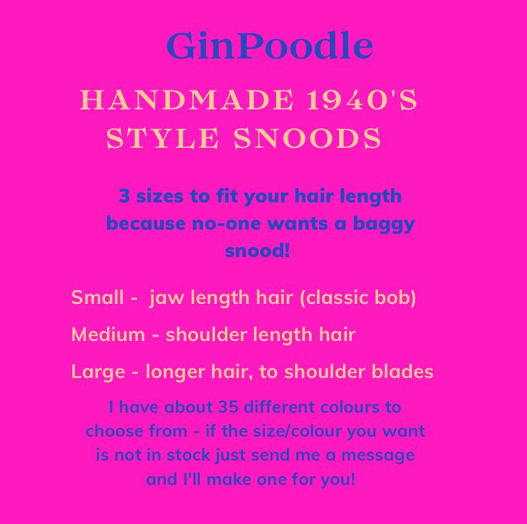 Keep your gorgeous 1940's curls and waves in perfect shape by wearing this snood on windy days, to sleep in or to give your outfit some retro chic. My snoods have the authentic neat look you want that you only get with a gathered net style whereas most other snoods available are more of a slouchy bag hat.
