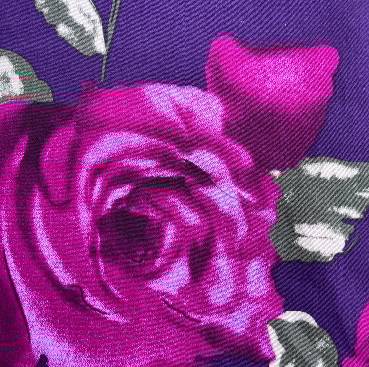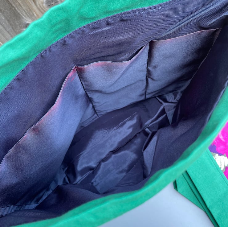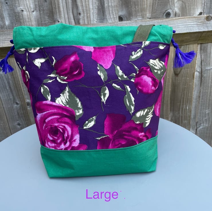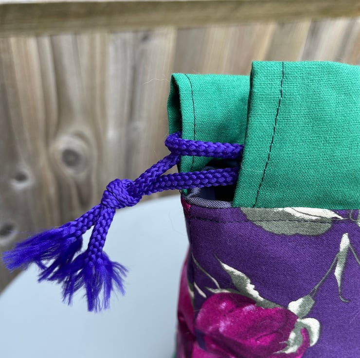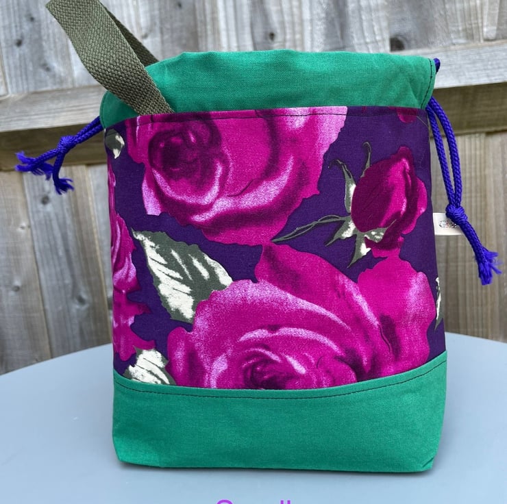 The outer fabrics are all cotton, the lining is a satin polyester with three roomy internal pockets. The main fabric is bright and bold print of large pinky purple roses on a rich purple background. This fabric is vintage, sourced from a local charity craft shop, I like to reuse, reclaim and recycle as much as possible.